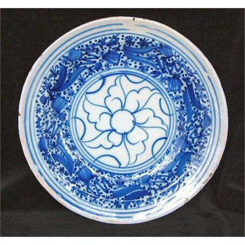 Large tin glazed Delft dish with hand painted blue pattern .In good condition without restoration although there are losses to the glaze around the rim. Some firing spits in the glaze and small areas where the body has not been covered by the glaze. Packing and postage to USA $48.00 , Uk £ 7.00