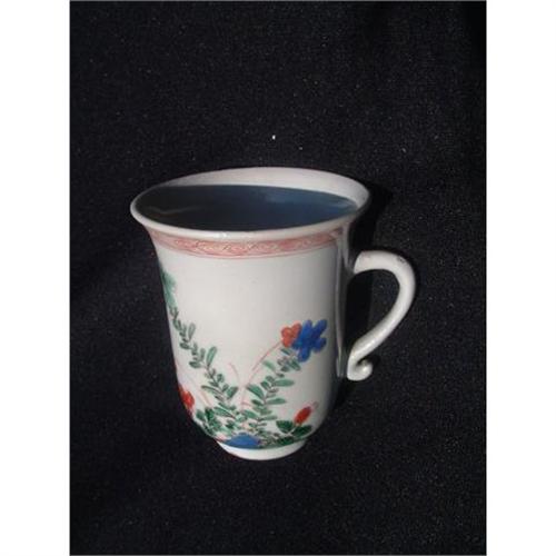 18th. century Chinese export porcelain cup with hand painted enamel floral decorations. Height: 3.5" (9 cm.). Diameter at base: 3" (7.5 cm.). Estimated retail value: $800.
