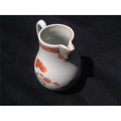 18th. century Chinese export porcelain pitcher with hand painted enamel floral decorations. Height: 3.8"" (9.5 cm.). Width: 4.5" (11.5 cm.). Estimated retail value: $1500.