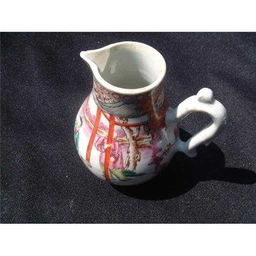 18th. century Chinese export porcelain Famille Rose pitcher with hand painted enamel figural decorations. Height: 4.8"(9 cm.). Width: 5" (12.5 cm.). Estimated retail value: $1600.