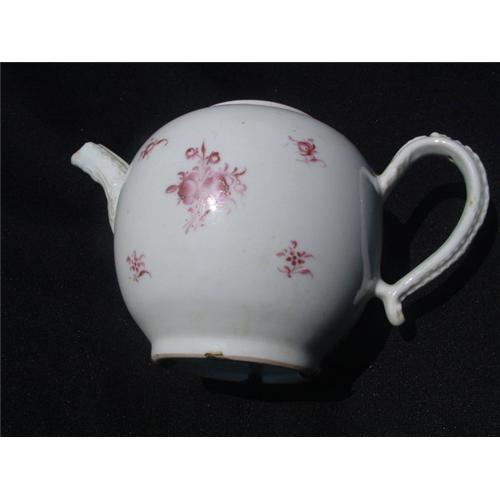 18th. century Chinese export porcelain teapot with hand painted floral decorations. Height: 6" (15 cm.). Width: 10" (26 cm.). Estimated retail value: $2400.