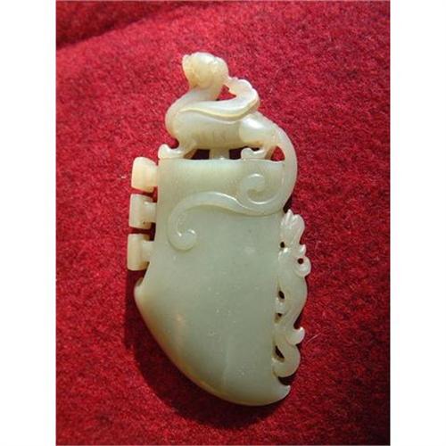 18th. century white-celadon jade carving in shape of an axe with a Bi Xi mythological animal riding on top of the axe. A hydra is carved on the side of the axe. The obverse is convex and the reverse is flat. Interestingly, the beast has a biforked tail that each part is featured on each side. This carving dates to reign of emperor Qien Lung and is a marvelous work of lapidary art. The carving features a homogenous color jade without any blemishes. Length: 4" (10 cm.). Width: 2" (5 cm.). Estimated value: $7000.
