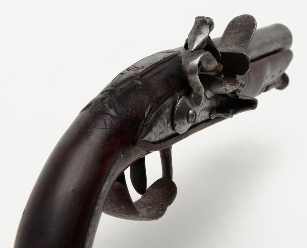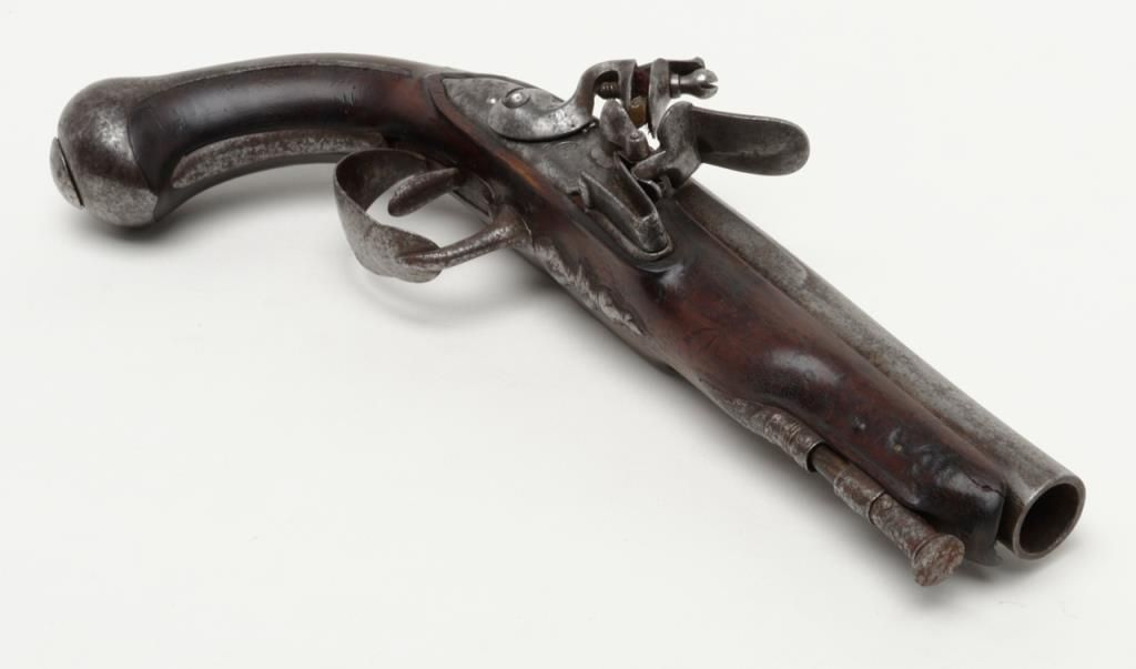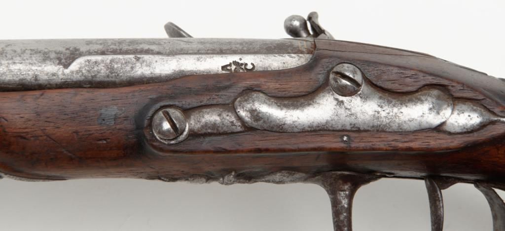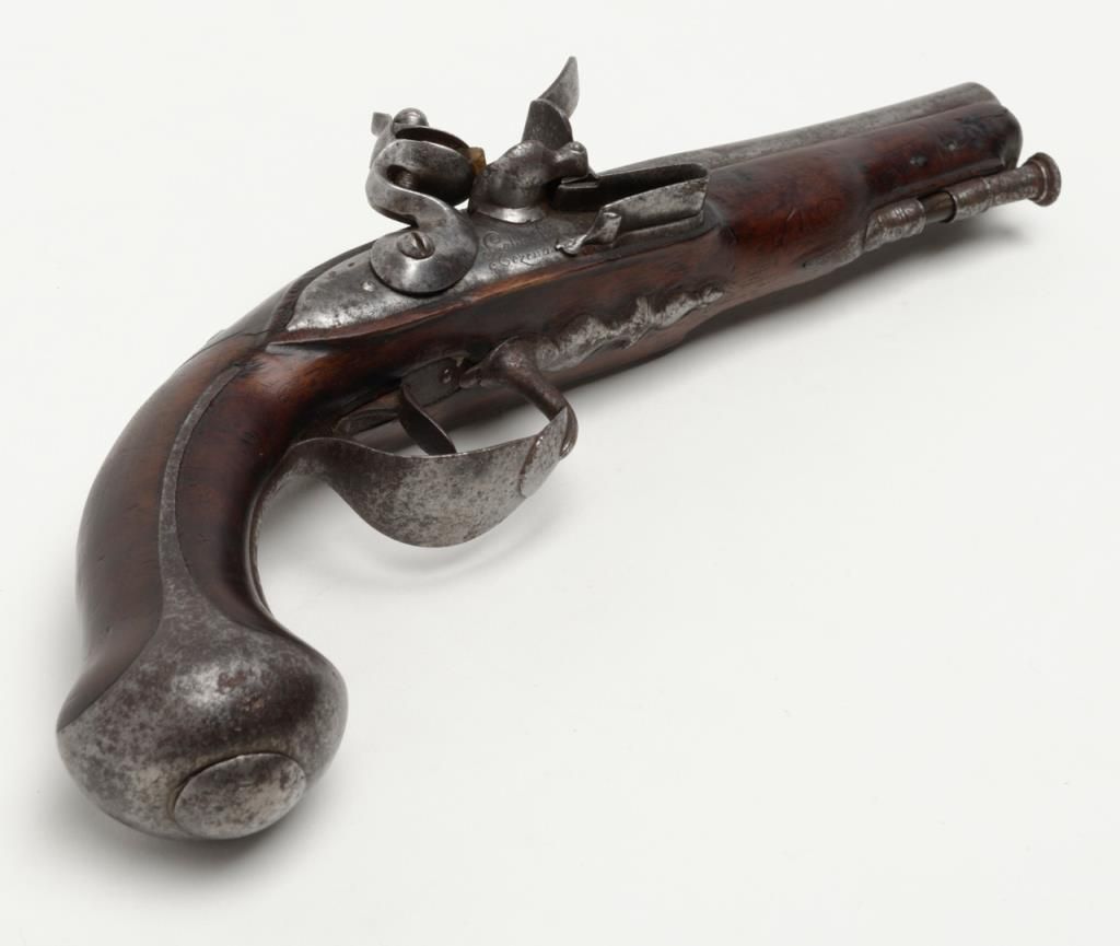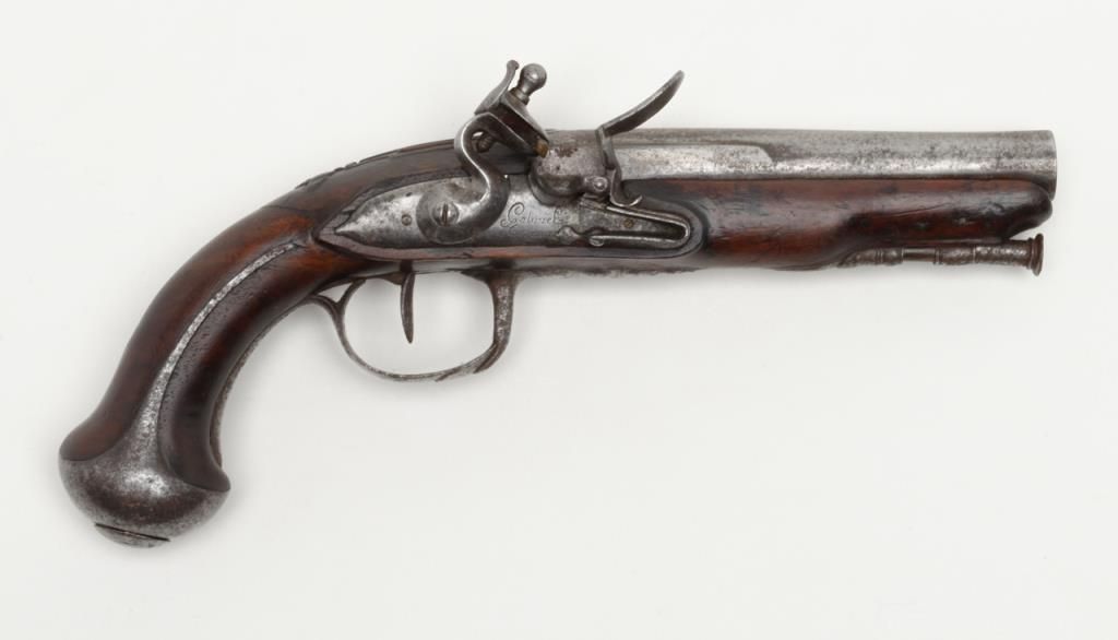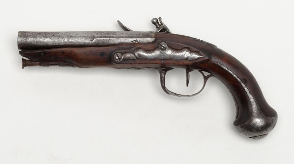 18th century French flintlock pockets size pistol signed “Gabriel Cezena” with iron mountings measuring approximately 10 ½” overall with 5 and nearly ½” barrel of approximately .58 caliber smoothbore. The lock retains its original hammerand small parts. The metal surfaces show some light to moderate pitting and erosion and trace of engraving and gold gilt on the barrel. The stock is fair to good with some minor losses of wood on the top edge of the forend on the left side.Otherwise normal aging and there is a St. Etienne proof on the left side of the breech. A metal tipped rammer with worm possibly the original is included. Est.: $400-$800