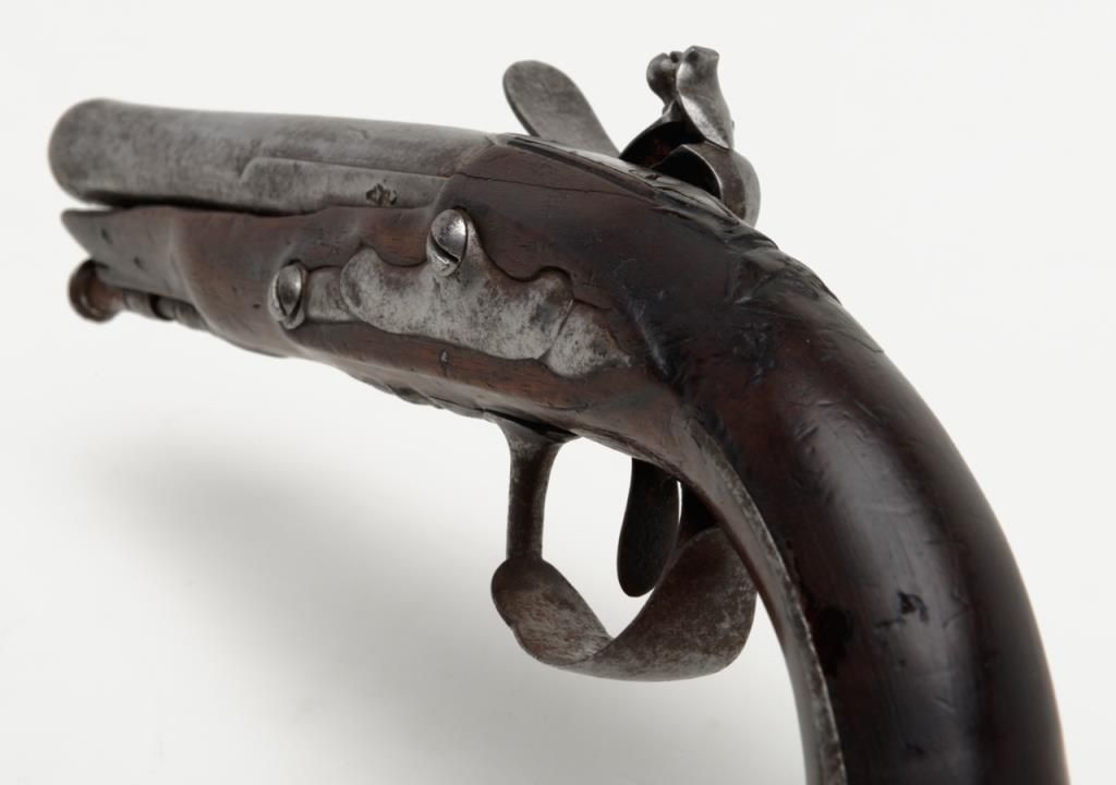 18th century French flintlock pockets size pistol  signed “Gabriel Cezena” with iron mountings  measuring approximately 10 ½” overall with 5 and  nearly ½” barrel of approximately .58 caliber  smoothbore. The lock retains its original hammerand small parts. The metal surfaces show some  light to moderate pitting and erosion and trace of  engraving and gold gilt on the barrel. The stock  is fair to good with some minor losses of wood on  the top edge of the forend on the left side.Otherwise normal aging and there is a St. Etienne  proof on the left side of the breech. A metal  tipped rammer with worm possibly the original is  included. Est.: $400-$800