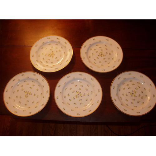 Beautiful set of 5 late 18th century Georgian English bone china plates. The plates are hand painted in the fashionable decor de la Rene or cornflower pattern with gold gilt borders. This pattern was first painted on Sevres porcelain For French Queen Marie Antoinette about 1774. Cornflowers were favored by Marie Antoinette. The cornflower pattern is regarded as a classic Louis XVI porcelain pattern . Condition: The plates has age crazing and a few hair lines. Measures 8-1/2 inches.