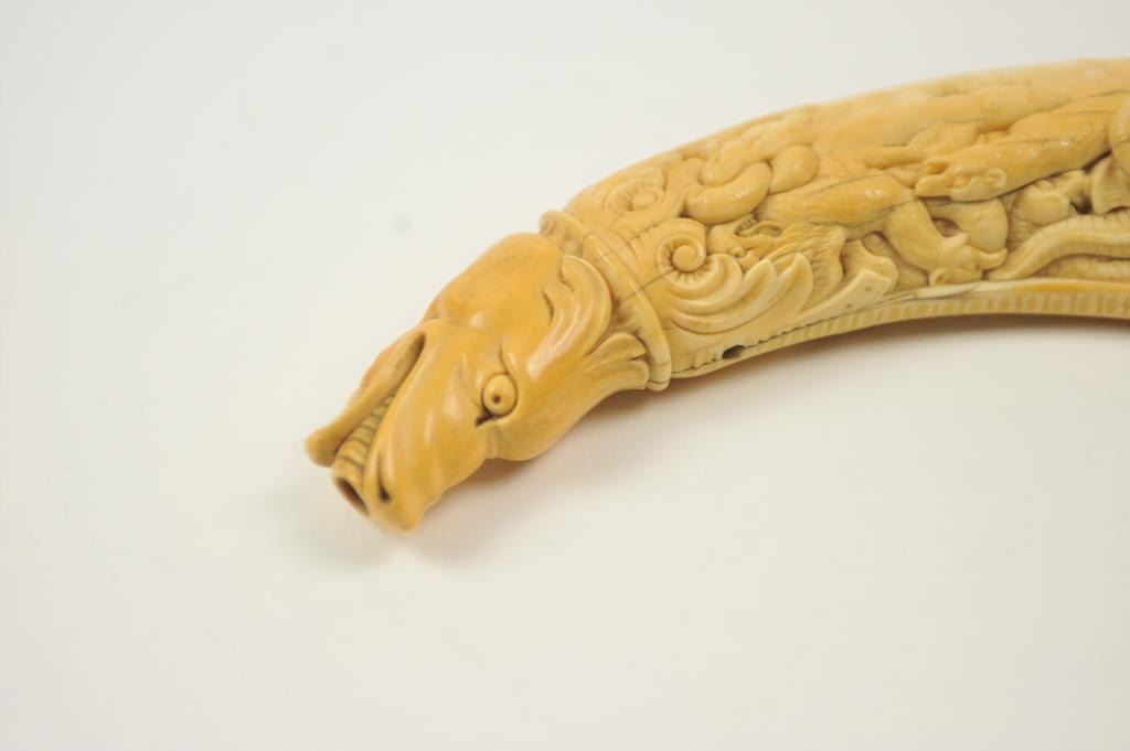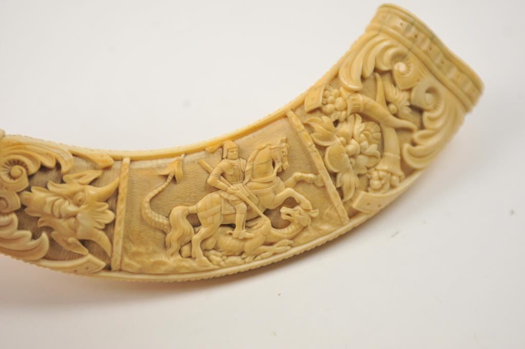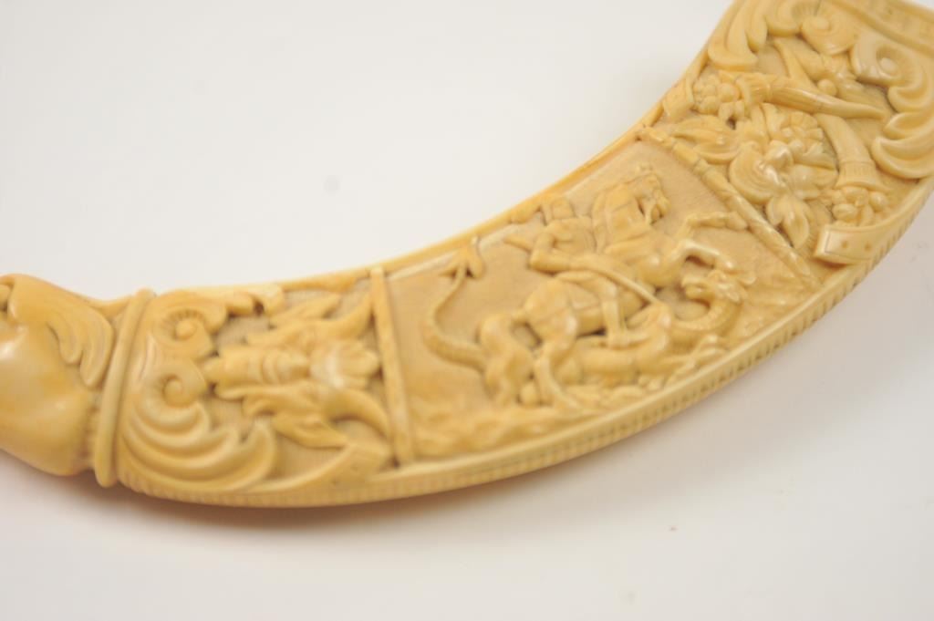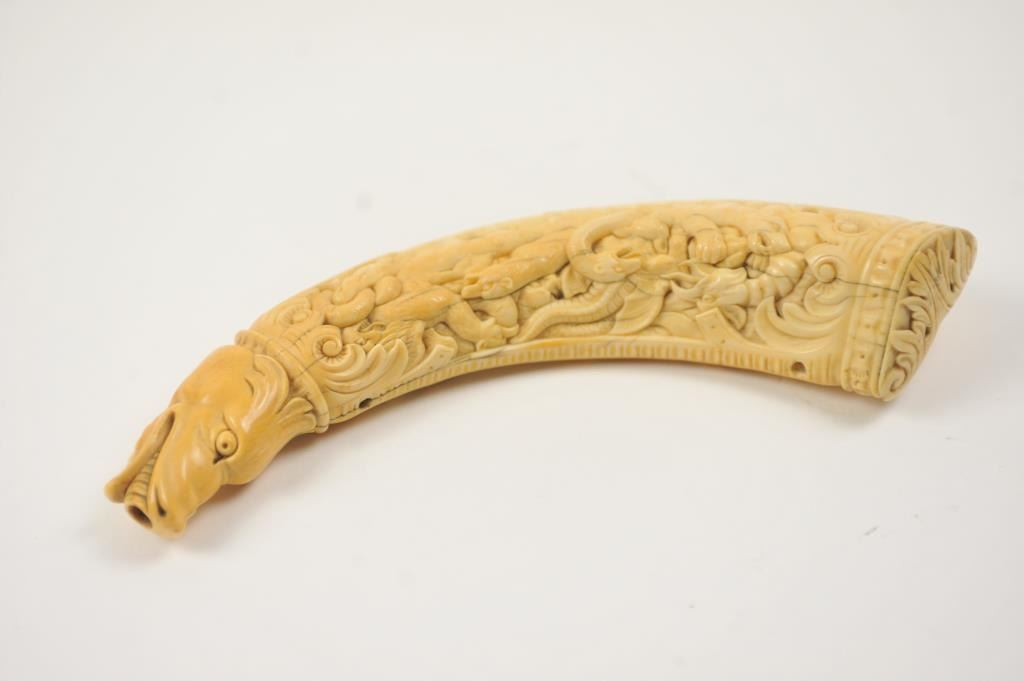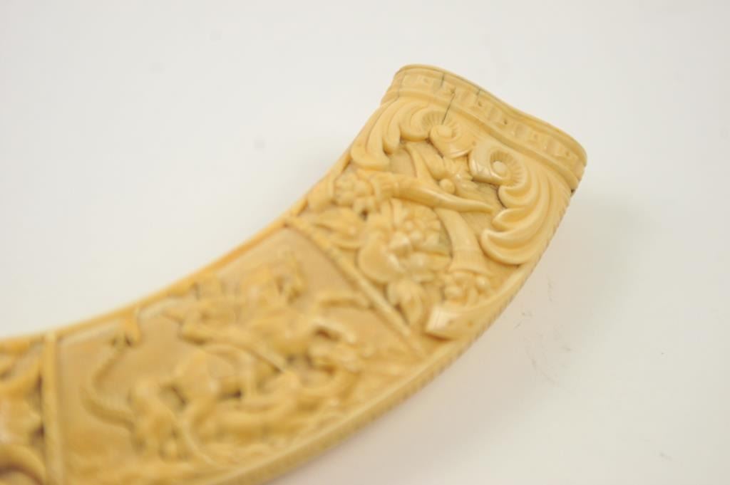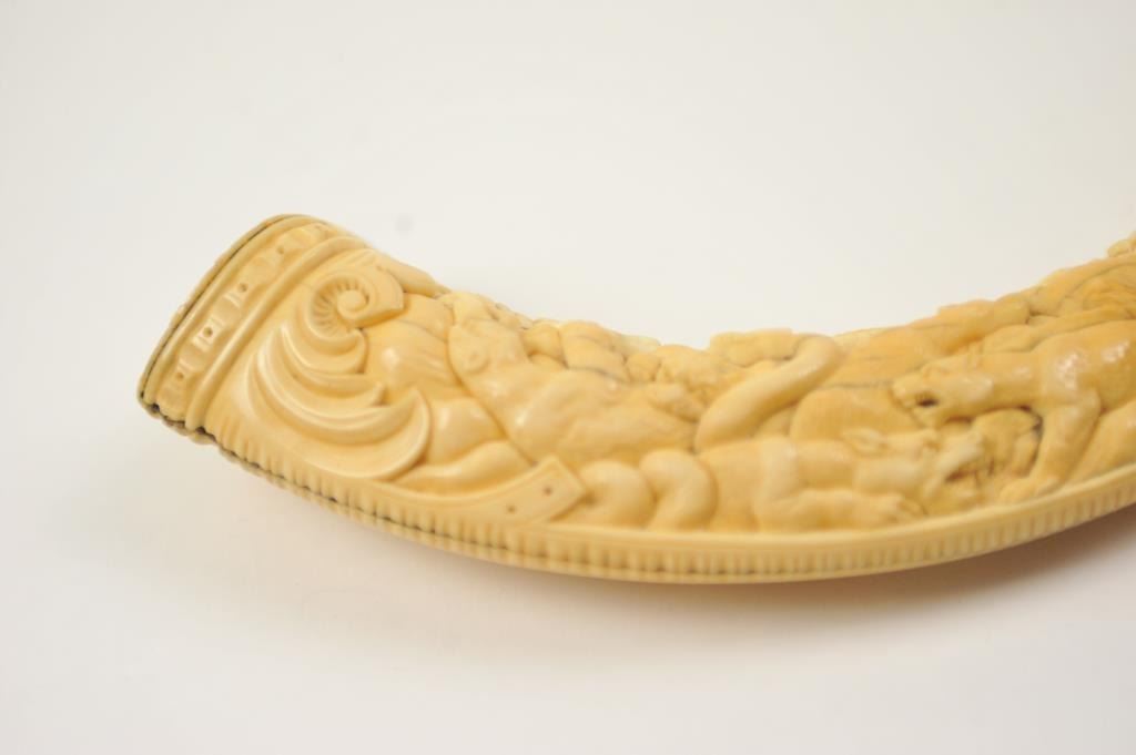 18th century carved ivory powder flask attributed to Deop. The flask measures 10 ½” overall, magnificently carved with intertwining game scenes on one side, while the other side depicts gothic and battlescenes. The flask has a dog head spout. A stunning work of art superior to many depicted in the definitive work on high art flasks, “The Sumptuous Flask”, by Herbert Houze. The condition is near fine with onlynormal yellowing and patina with a long crack at the seam, age cracks and checking. Letters of appraisal from two noted European arms experts included as to the age and origin of the piece. A nine on a scale of1-10, suitable for a sophisticated collector or museum. Est.: $5,000-$10,000.