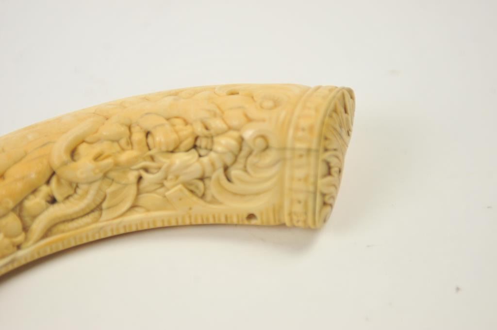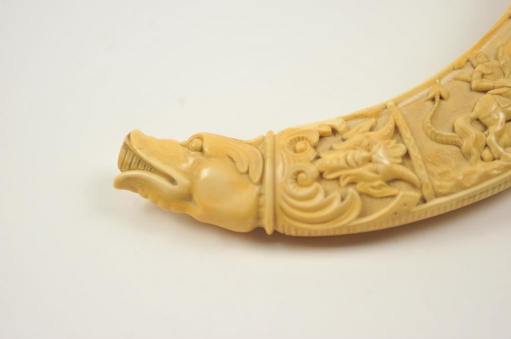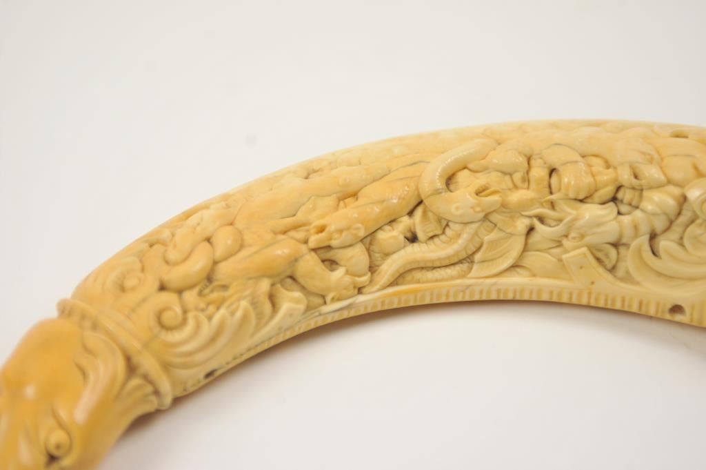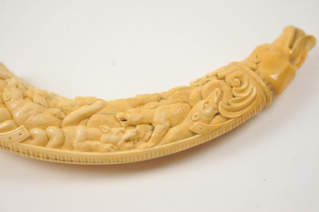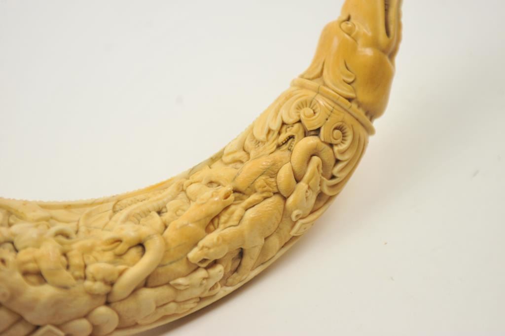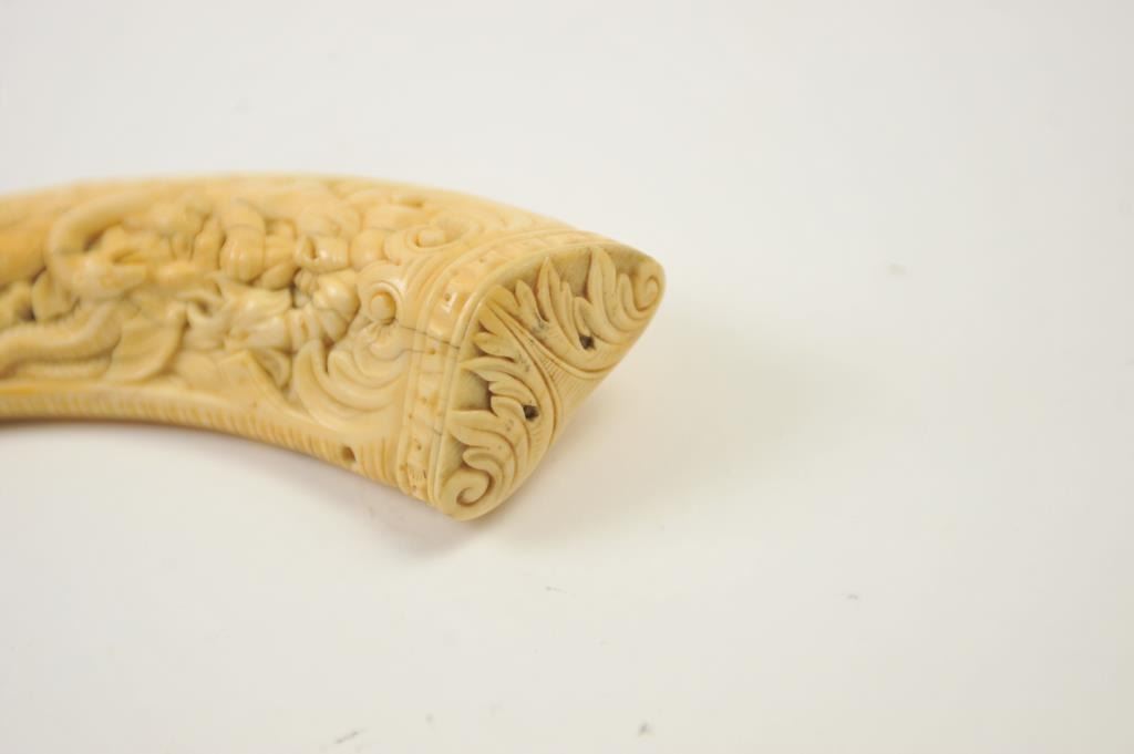 18th century carved ivory powder flask attributed to Deop. The flask measures 10 ½” overall, magnificently carved with intertwining game scenes on one side, while the other side depicts gothic and battlescenes. The flask has a dog head spout. A stunning work of art superior to many depicted in the definitive work on high art flasks, “The Sumptuous Flask”, by Herbert Houze. The condition is near fine with onlynormal yellowing and patina with a long crack at the seam, age cracks and checking. Letters of appraisal from two noted European arms experts included as to the age and origin of the piece. A nine on a scale of1-10, suitable for a sophisticated collector or museum. Est.: $5,000-$10,000.