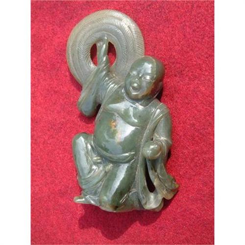 18th. century celadon green jade carving in shape of a smiling man holding a hat straw in his right hand. Rare emerald green color of translucent high quality of jade. Provenance: Dr. Veleanu's collection, the author of the collectors' textbook: "Jade, 5000 BC, to 1912 AD, Guide to collectors". Estimated value: $2.500.