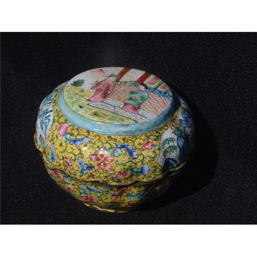 18th. century, Qing period enamel on brass box decorated with figural and floral design. Intact and as such, rare. The interior enamel is lavender colored and intact. Height: 2.8" (7 cm.), diameter: 3.5" (9 cm.).