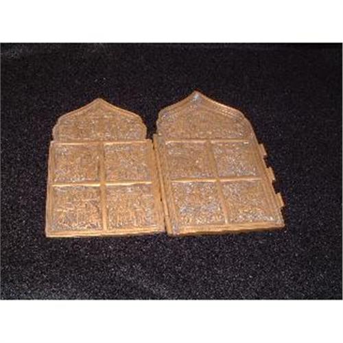 18th. century Russian diptych brass icon with 10 relief enameled panels representing scenes from Jesus life. Estimated value: $900.