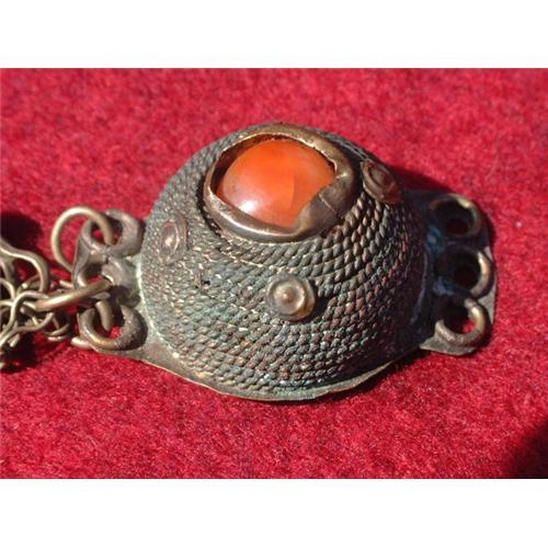 18th. century Moroccan silver pendant with carnelian decoration. It is in perfect condition considering the age normal wear and patina. Length: 3.5" (9 cm.) Estimated retail value: $350.