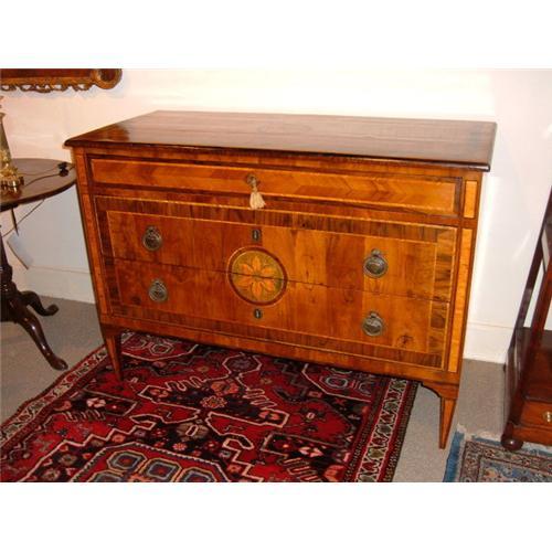 Three drawer commode with wonderful inlay, Milan, Italy. Needs veneer work, but otherwise is in very good condition. Inquire for further photos.