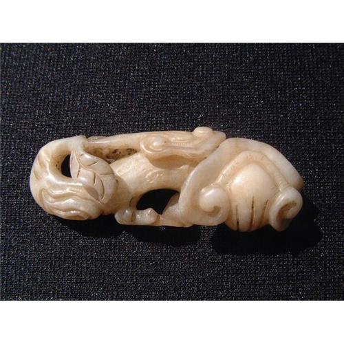 18th. century white jade hand-carved in shape of a ling zhi sprig. It is a marvelous miniature carving in white jade featuring ling zhi in open work and high relief. length: 2.6" (6.5 cm.). Width: 1" (2.5 cm.). This is a master work dating to the period of emperor Qien Lung that reigned China for 60 years at the peak of thriving arts. The price of Khotan white jade (even for modern carvings) increased 10 times fold in the past few years due to the tremendous demand of buyers from China. Provenance: Dr. Veleanu's jade collection, the author of the collectors' textbook: "Jade, 5000 BC to 1912 AD". Estimated value: $2000.