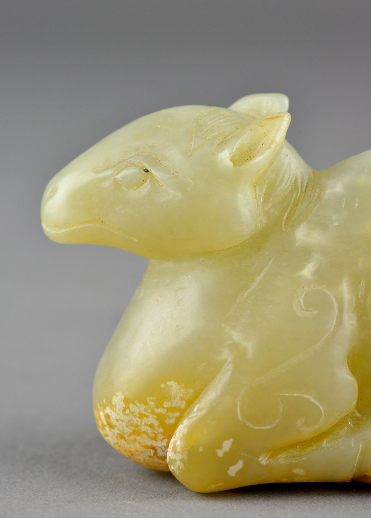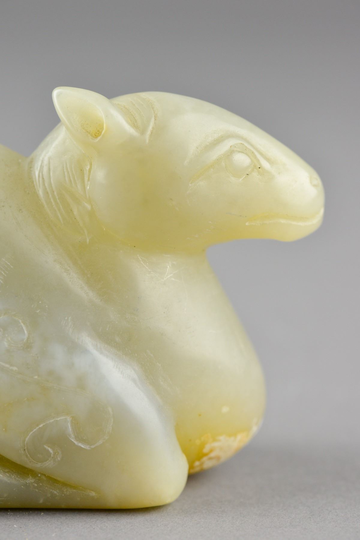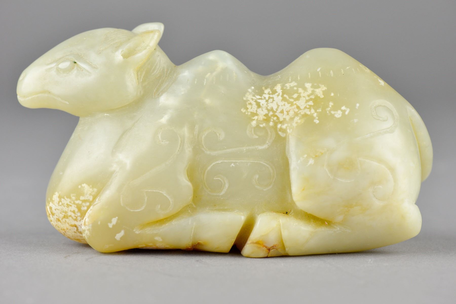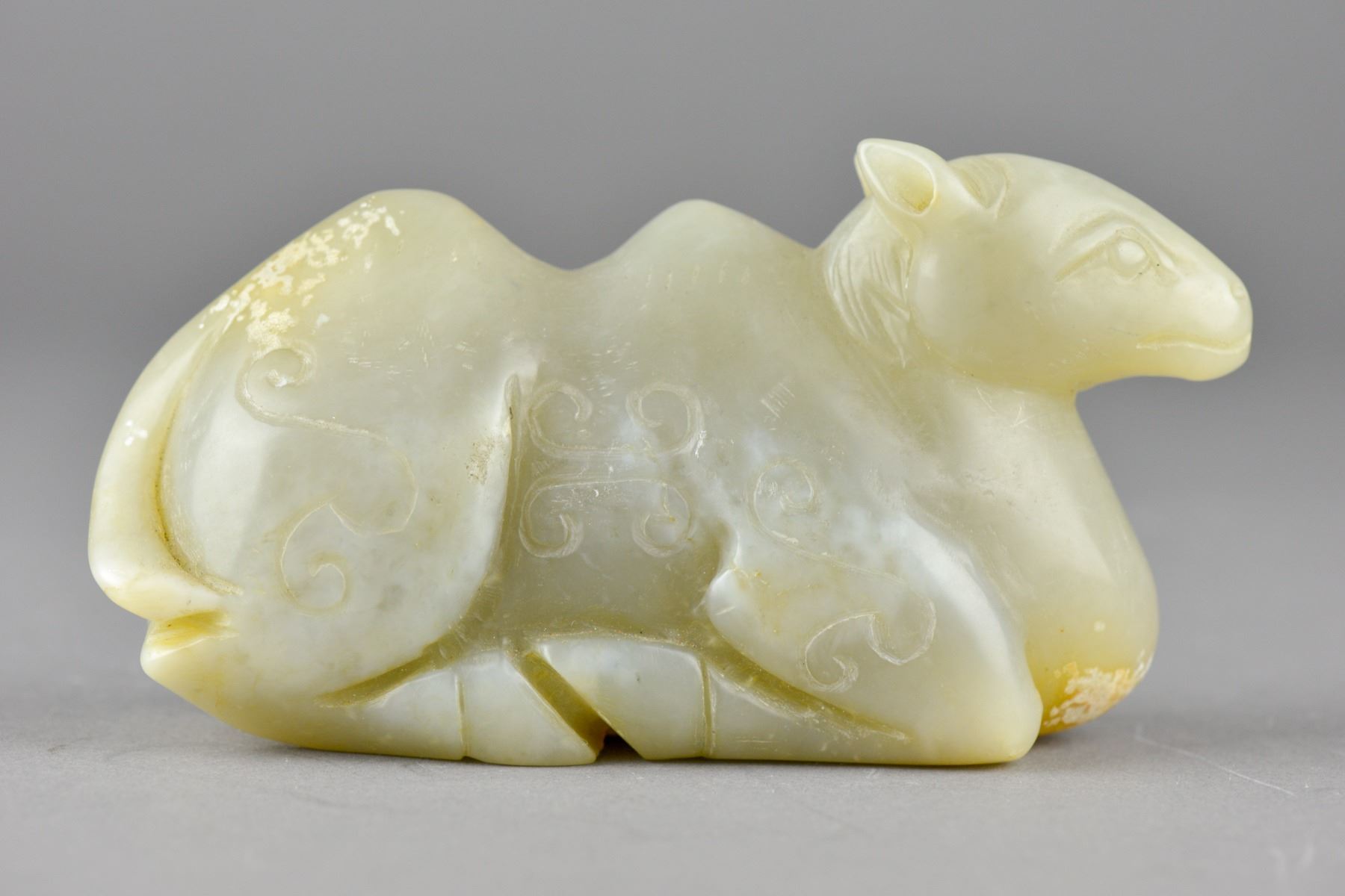 Chinese carved jade figure; featuring camel with incised ruyi-heads; the stone of translucent white tone, 18th/19th Century; L: 13 cm, W: 4.25 cm, H: 6.5 cm, 489 grams
