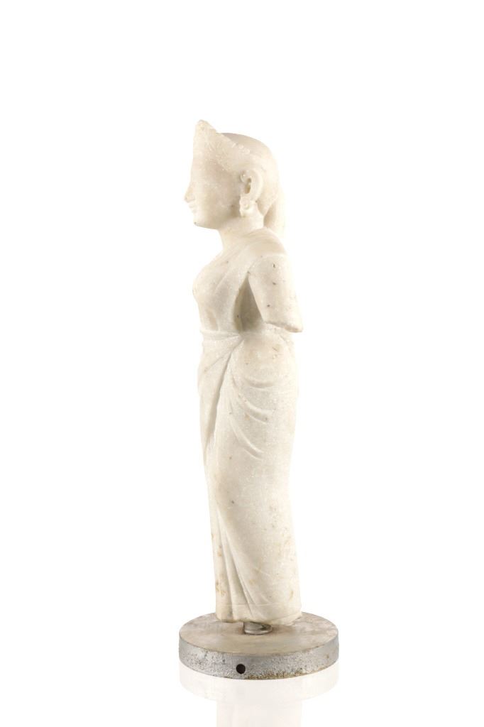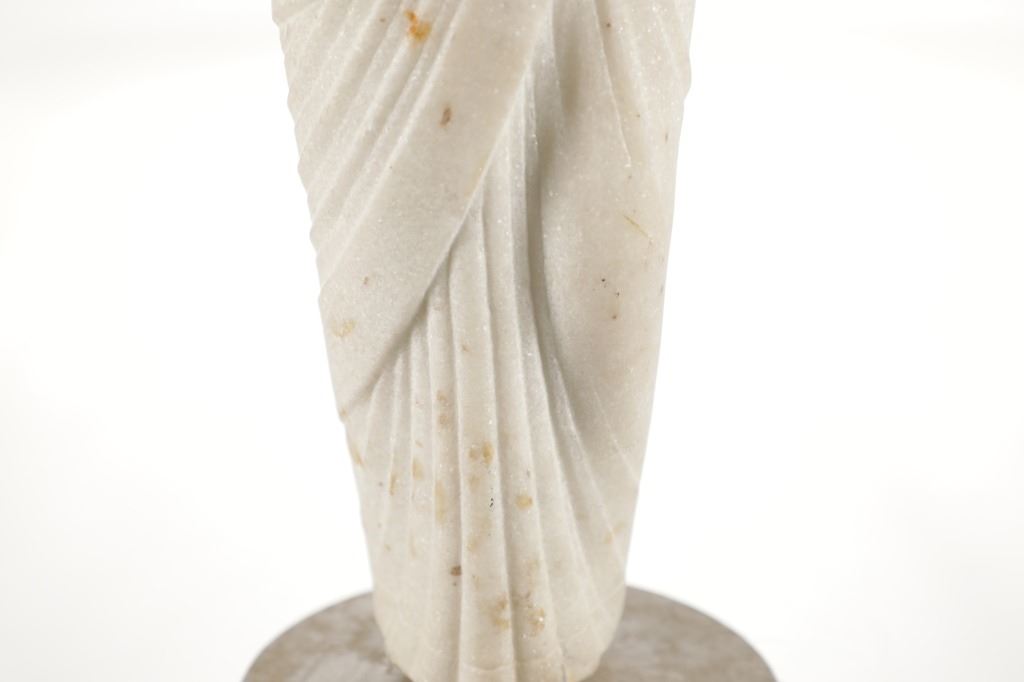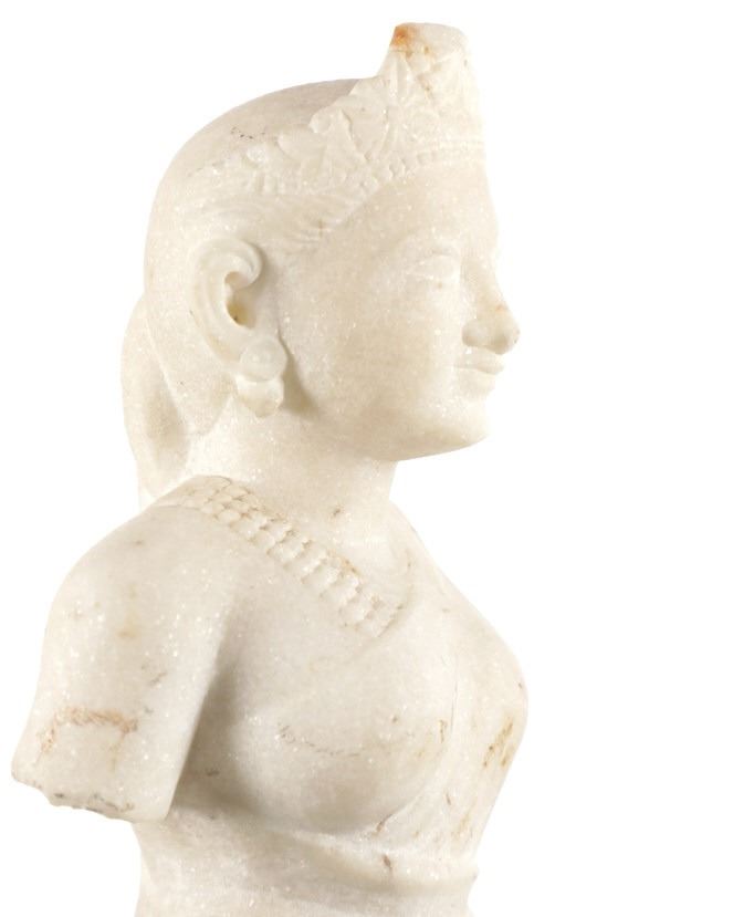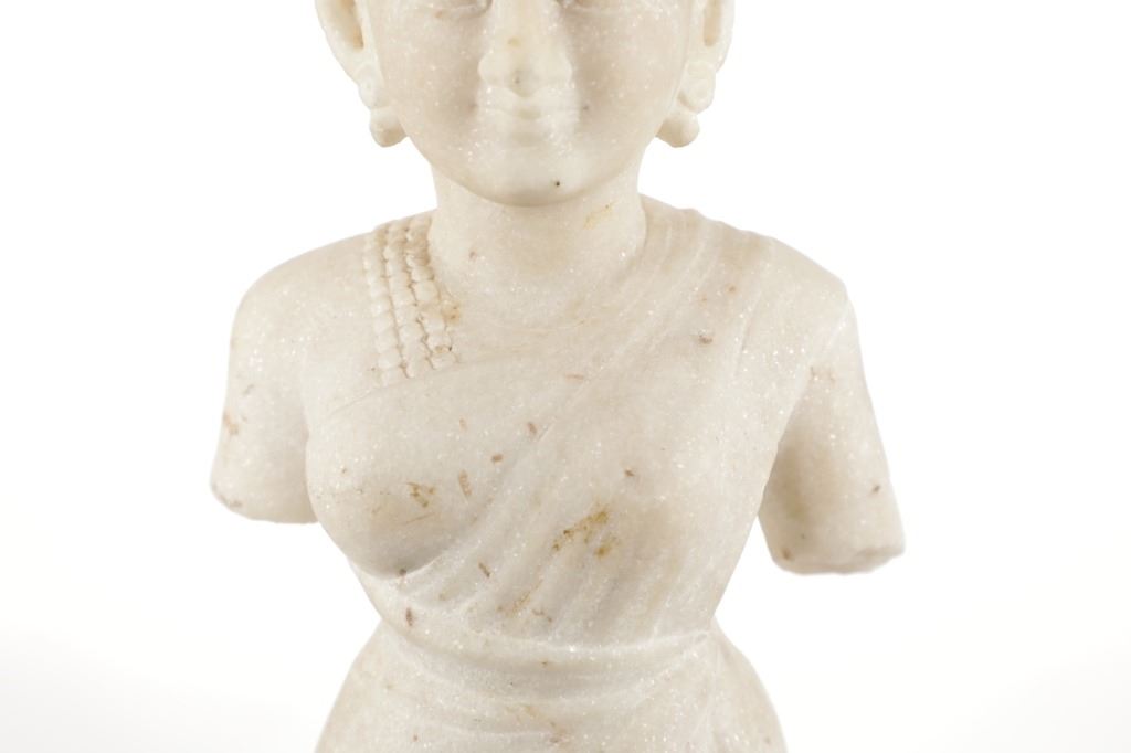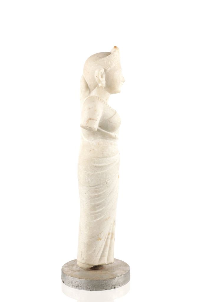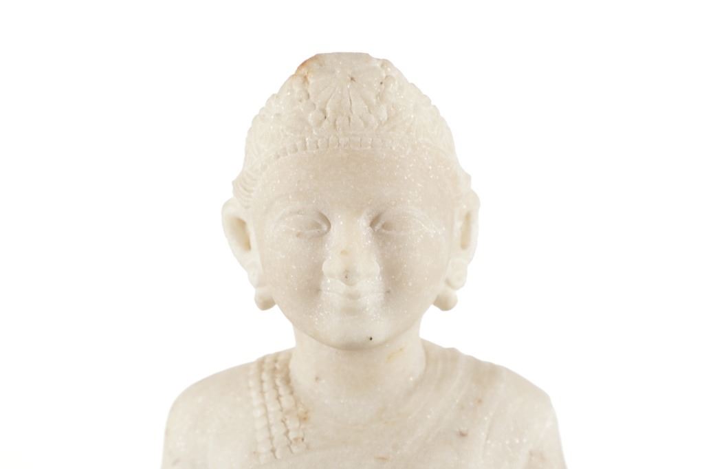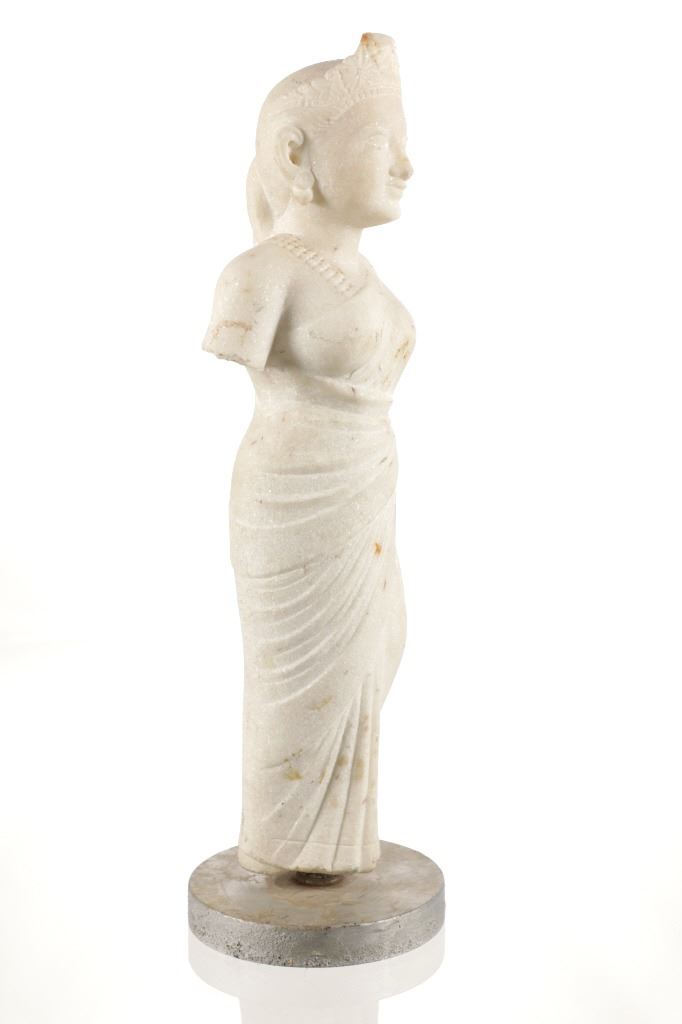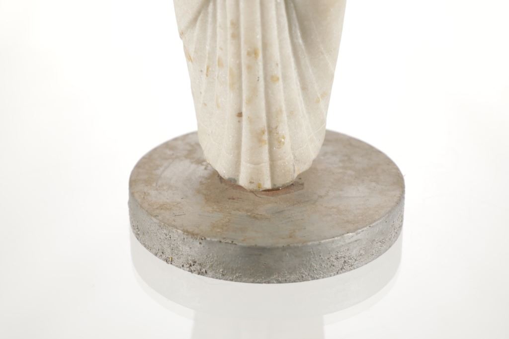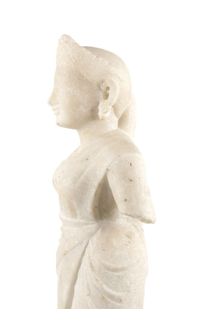 This is an original 18th Century to 19th Century Guan Yin White Quartz entryway garden statue on a metal base. In Chinese mythology, Guanyin (??) is the goddess of mercy and considered to be the physical embodiment of compassion. Guan Yin is the Bodhisattva of Great Compassion in Mahayana Buddhism and is also worshipped by Taoists. The name Guan Yin also spelt Guan Yim, Kuan Yim, Kwan Im, or Kuan Yin, is a short form for Kuan-shi Yin, meaning "Observing the Sounds (or Cries) of the (human) world. In the modern period, Guan Yin is most often represented as a beautiful, white-robed woman, a depiction which derives from the earlier Pandaravasini form. The arm-less statue appears to have been used as a garden statue, the metal base exhibits oxidation and rust on the undeside, oxidation noted around base rim. Statue appears in good overall condition, soiling observed consistent with use in outdoors. Approximate measurements 20"H x 6.25"W, base is 6" diameter. Weight approximate is 20lb, 6oz