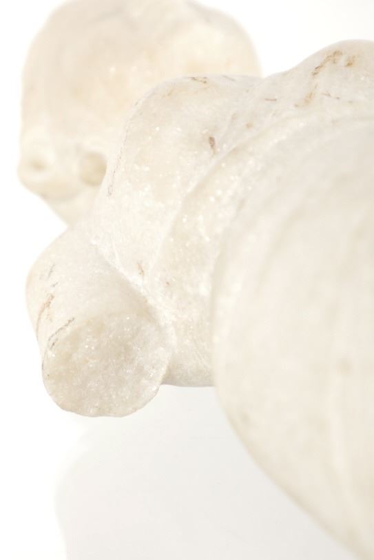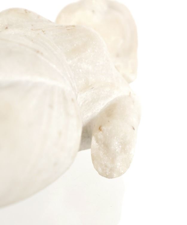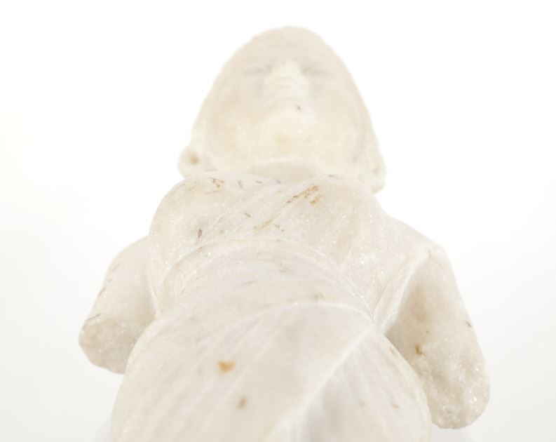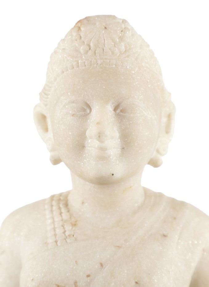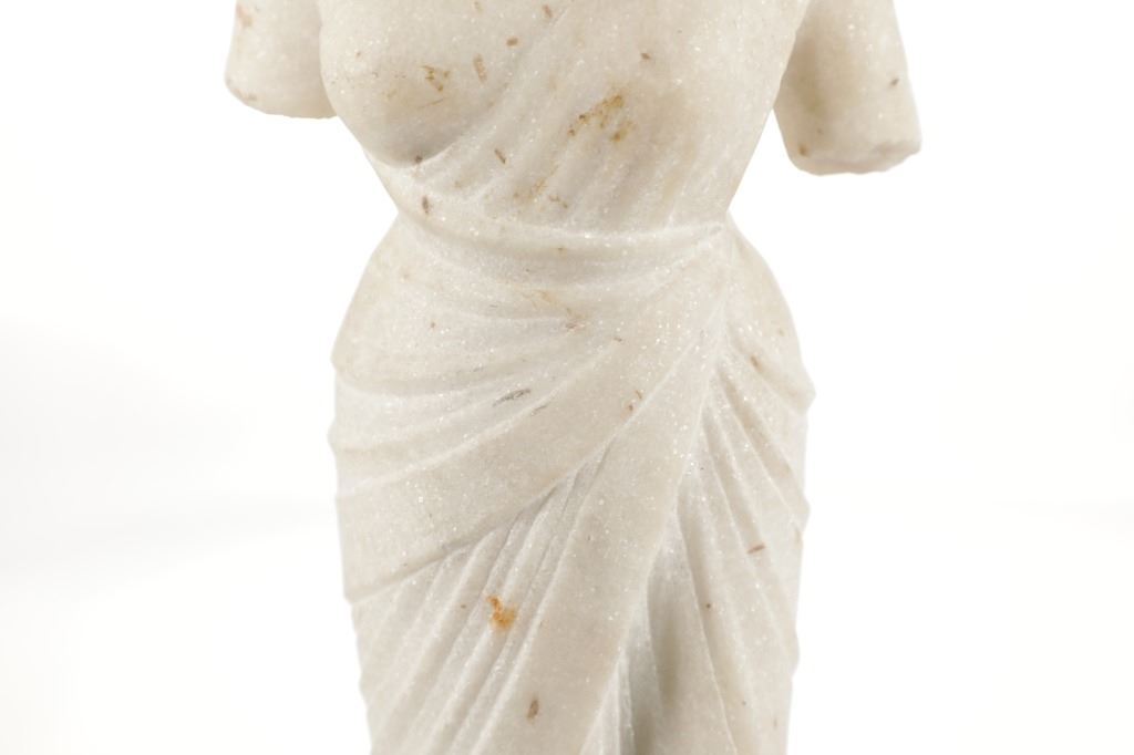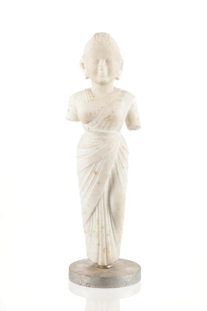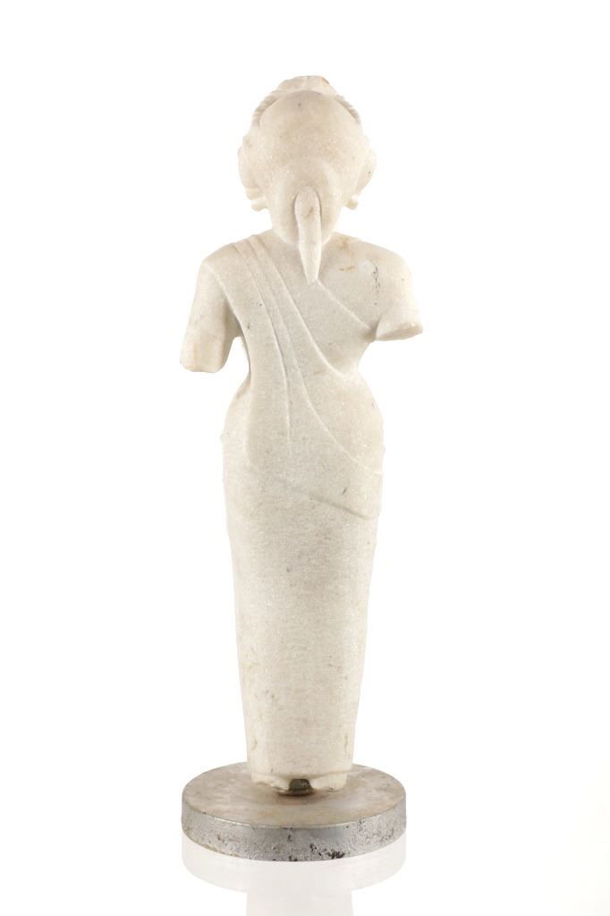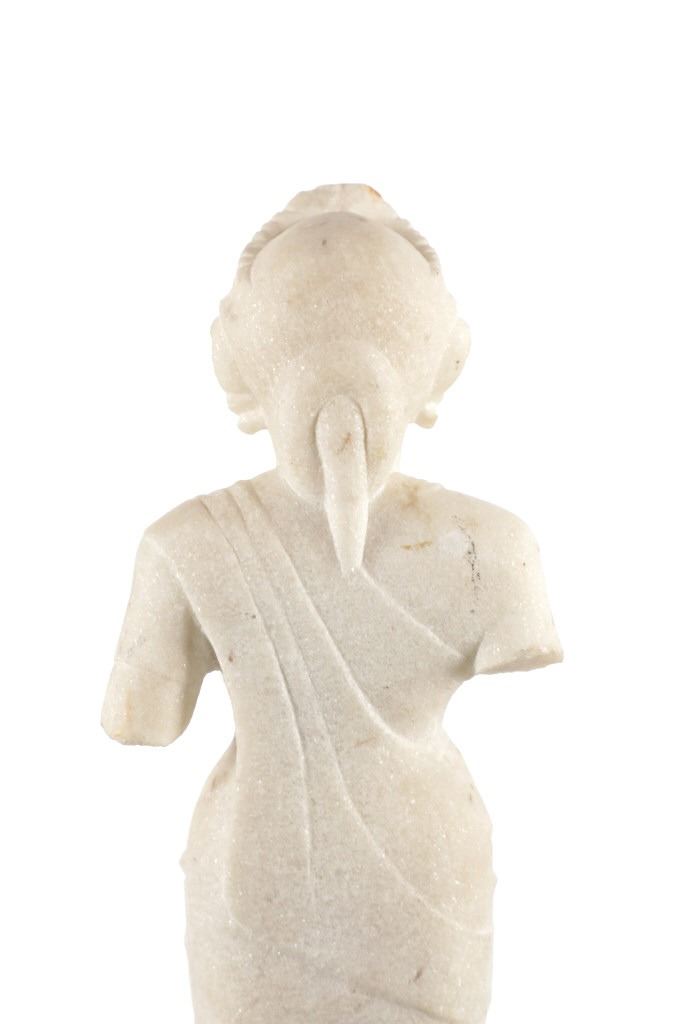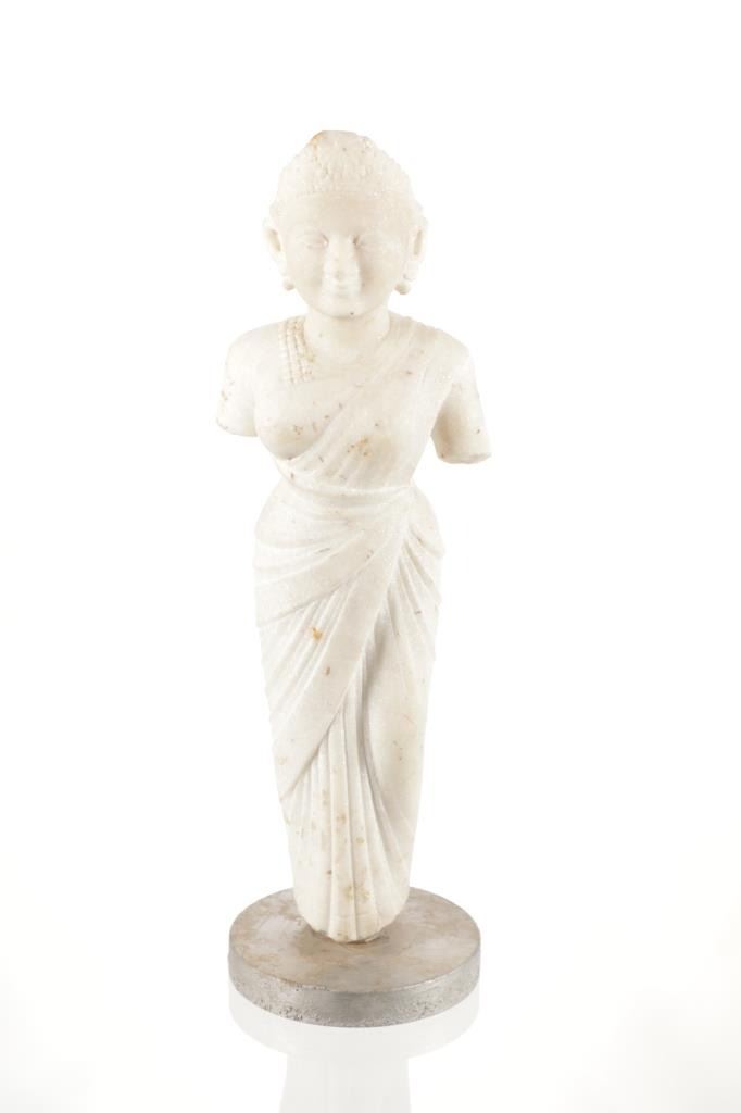 This is an original 18th Century to 19th Century Guan Yin White Quartz entryway garden statue on a metal base. In Chinese mythology, Guanyin (??) is the goddess of mercy and considered to be the physical embodiment of compassion. Guan Yin is the Bodhisattva of Great Compassion in Mahayana Buddhism and is also worshipped by Taoists. The name Guan Yin also spelt Guan Yim, Kuan Yim, Kwan Im, or Kuan Yin, is a short form for Kuan-shi Yin, meaning "Observing the Sounds (or Cries) of the (human) world. In the modern period, Guan Yin is most often represented as a beautiful, white-robed woman, a depiction which derives from the earlier Pandaravasini form. The arm-less statue appears to have been used as a garden statue, the metal base exhibits oxidation and rust on the undeside, oxidation noted around base rim. Statue appears in good overall condition, soiling observed consistent with use in outdoors. Approximate measurements 20"H x 6.25"W, base is 6" diameter. Weight approximate is 20lb, 6oz