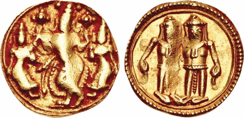 18th to 19th century, Gold Token, 3.24g, Obverse: Vishnu standing facing, flanked by goddesses, Reverse: two deities standing facing, unpublished in the standard references. Very Fine+, Very Rare.
