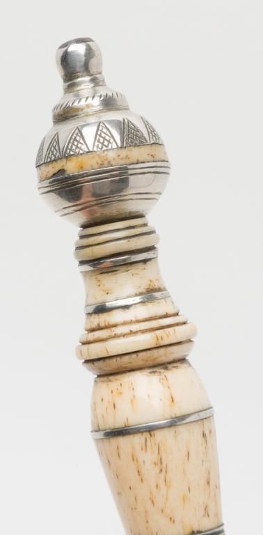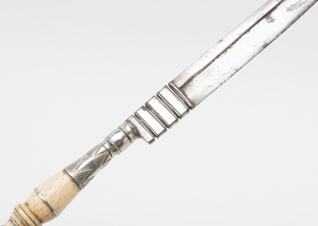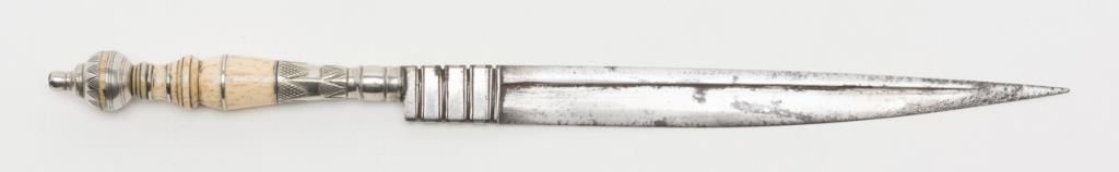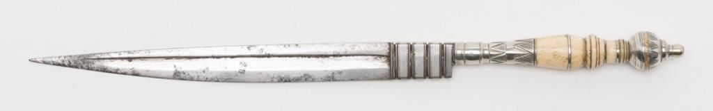 18th to 19th century dagger with turned bone grip and silver mounts used from southern Italy down through the Mediterranean and Greece to the Middle East. No scabbard or identifying marks. Some minor pitting on the blade but generally goodoverall. Est.: $200-$400