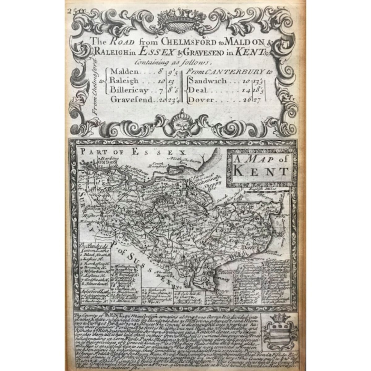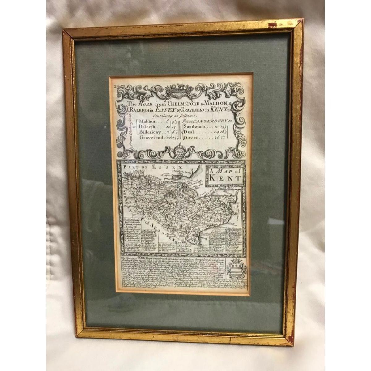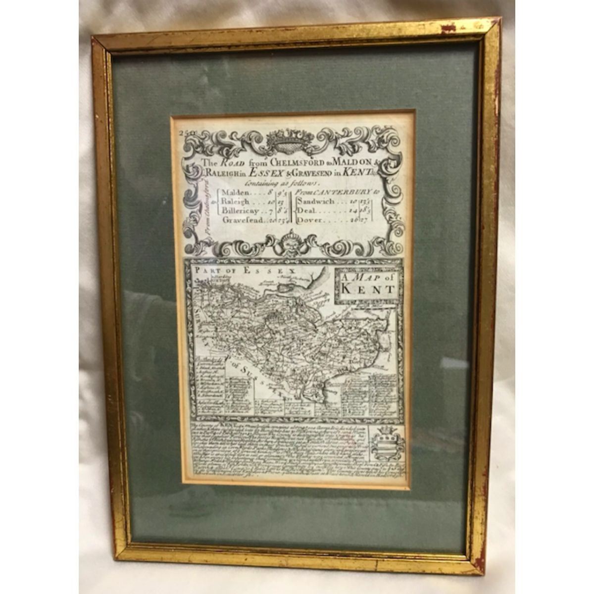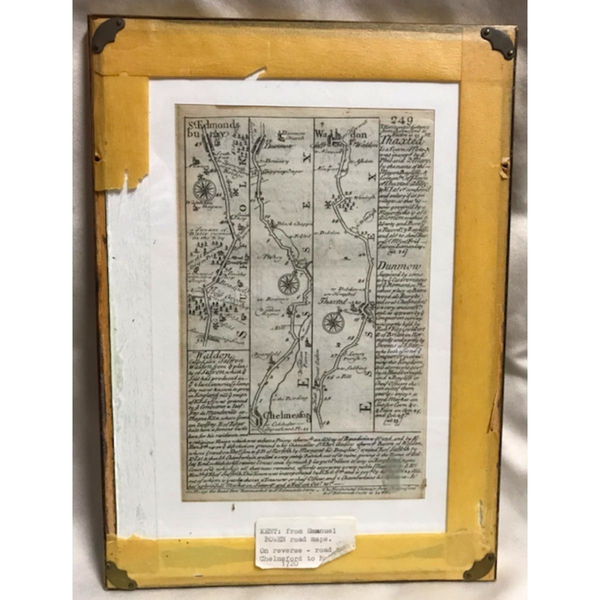 Original, antique, copper-plate engraved, double sided Road Map of Kent, England, compiled by John Owen and engraved by Emmanuel Bowen in the 1720 edition of Britannia Depicta or Ogilby Improved. Framed under glass in a gilt frame, the reverse side open to reveal another map of the road from Chelmsford to Maldon. Approx 5" X 7" map size in 7 3/4" X 10 3/4" frame.Â