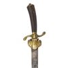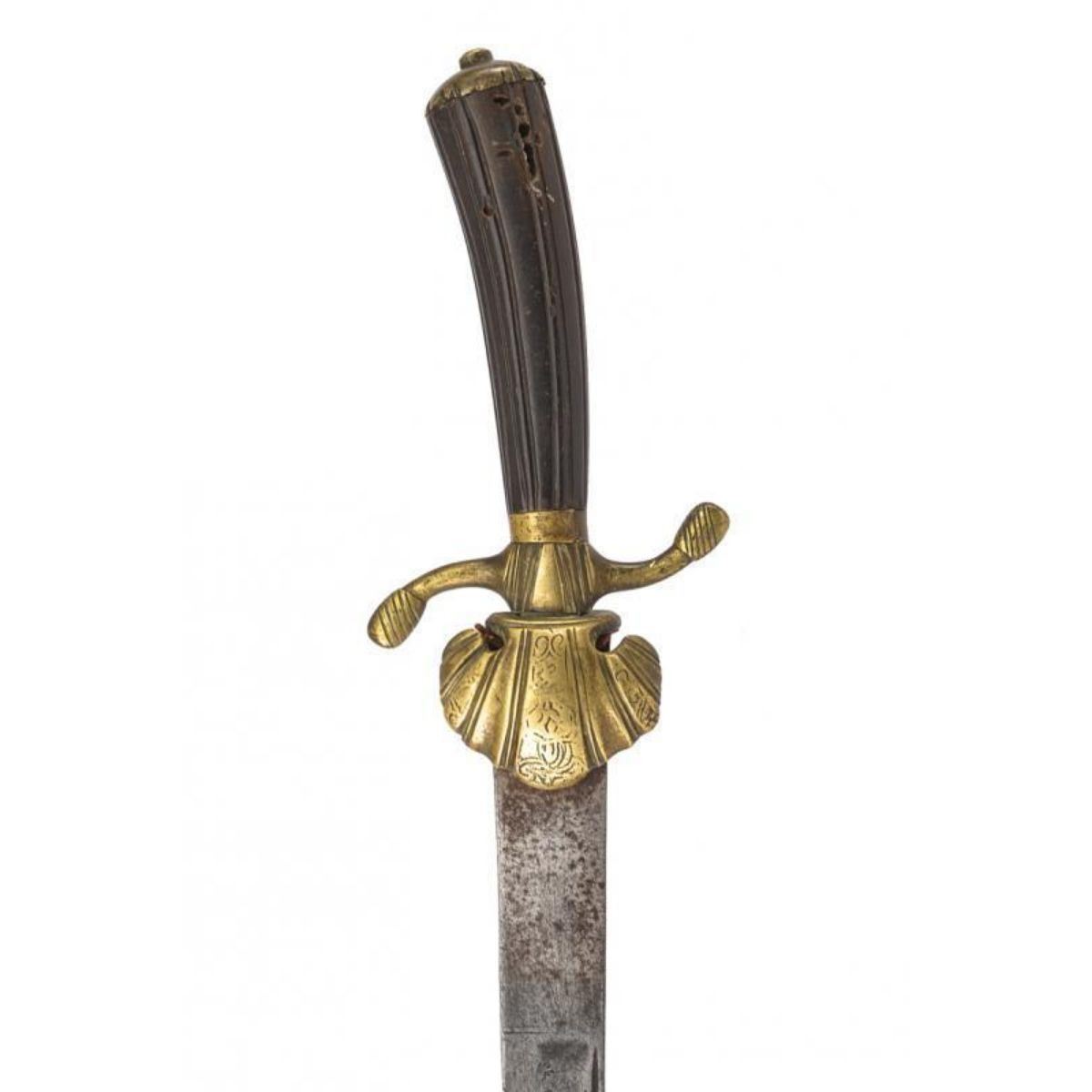 Late 18thc German straight blade with a thread & counter-thread, the first part with remains of engravings with hunting motifs, leaping stags; brass furnishing with pelta, solid wood & grooved hood, the pelta also engraved. Horn handle with longitudinal grooves. 24 1/2" ( 62 cm ). 10121-040518-CZ-01217