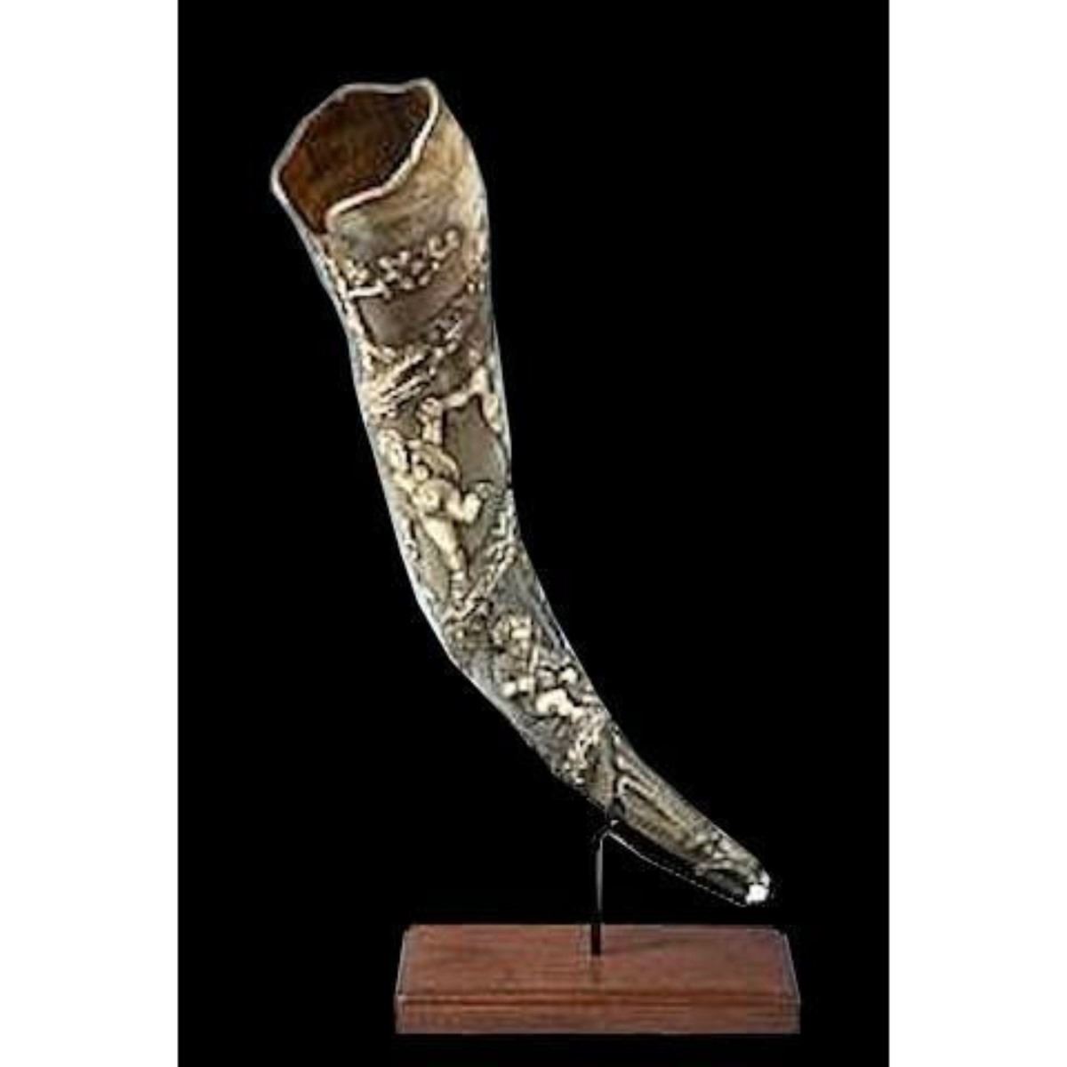 Early hand-carved hunting horn - 18thc European, probably German, from an ox horn. Carved with spiral rank of dancing putti, one with cloven hooves & two additional cloven hoofed putti playing instruments, ending with an ancient elm, in the form of a 'Horn-of-Plenty' or cornucopia, with dragon-form tip & fluted opening. 21" L X 4" W at widest point.