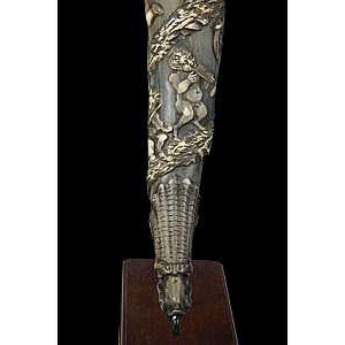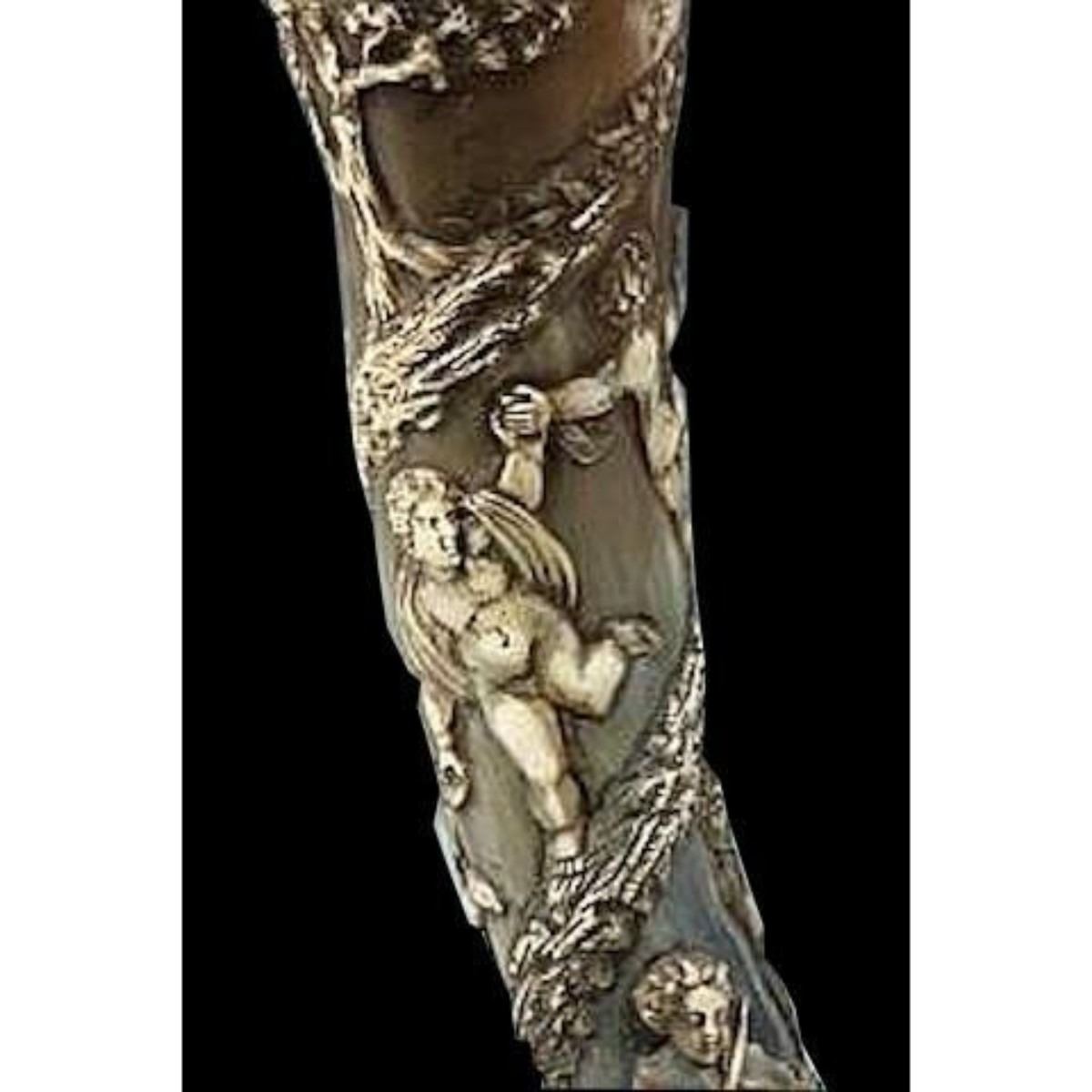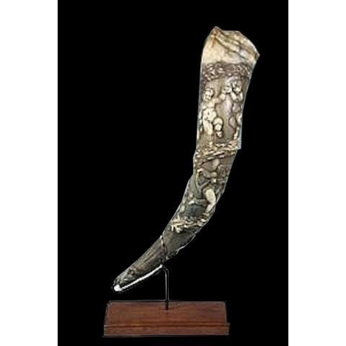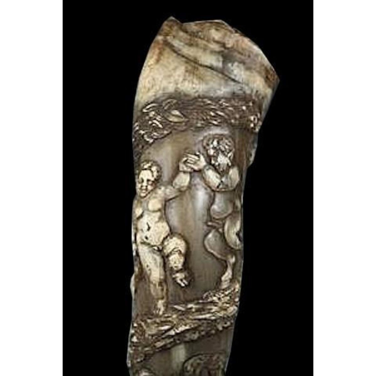 Early hand-carved hunting horn - 18thc European, probably German, from an ox horn. Carved with spiral rank of dancing putti, one with cloven hooves & two additional cloven hoofed putti playing instruments, ending with an ancient elm, in the form of a 'Horn-of-Plenty' or cornucopia, with dragon-form tip & fluted opening. 21" L X 4" W at widest point.