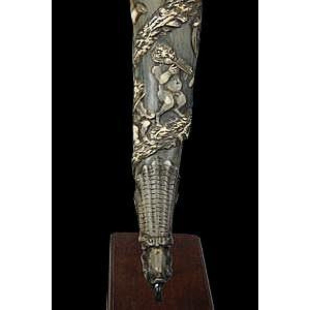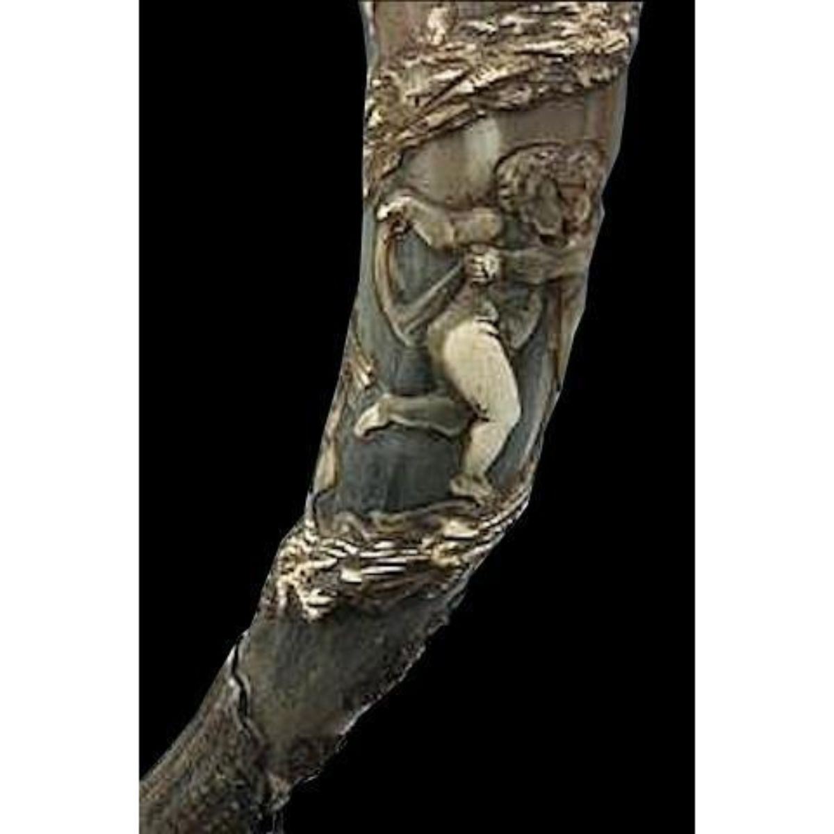 Early hand-carved hunting horn - 18thc European, probably German, from an ox horn. Carved with spiral rank of dancing putti, one with cloven hooves & two additional cloven-hoofed putti playing instruments, ending with an ancient elm, in the form of a 'Horn-of-Plenty' or cornucopia, with dragon-form tip & fluted opening. 21" L X 4" W at widest point.