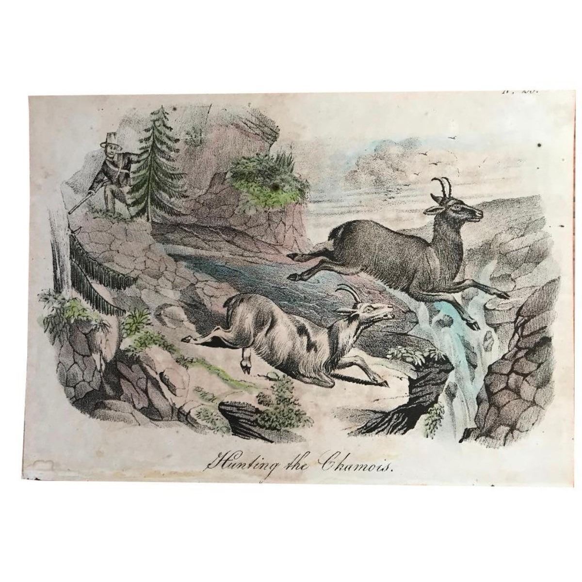 Hand-colored engraving, from an 18th Century German book ( bookplate ). "Hunting The Chamois", depicting a hunter at top left in pursuit of two chamois, mountain goats. 5" X 7".  * some foxing commensurate to age.