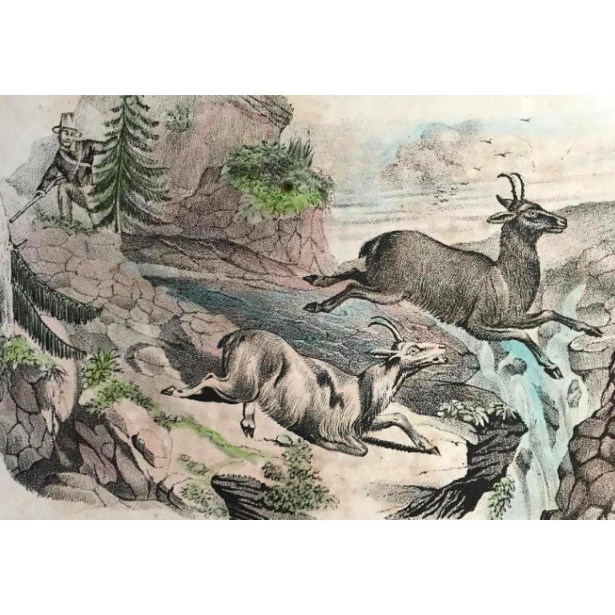 Hand-colored engraving, from an 18th Century German book ( bookplate ). "Hunting The Chamois", depicting a hunter at top left in pursuit of two chamois, mountain goats. 5" X 7".  * some foxing commensurate to age.