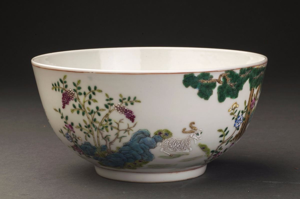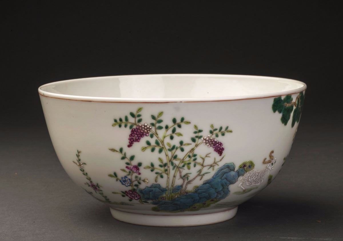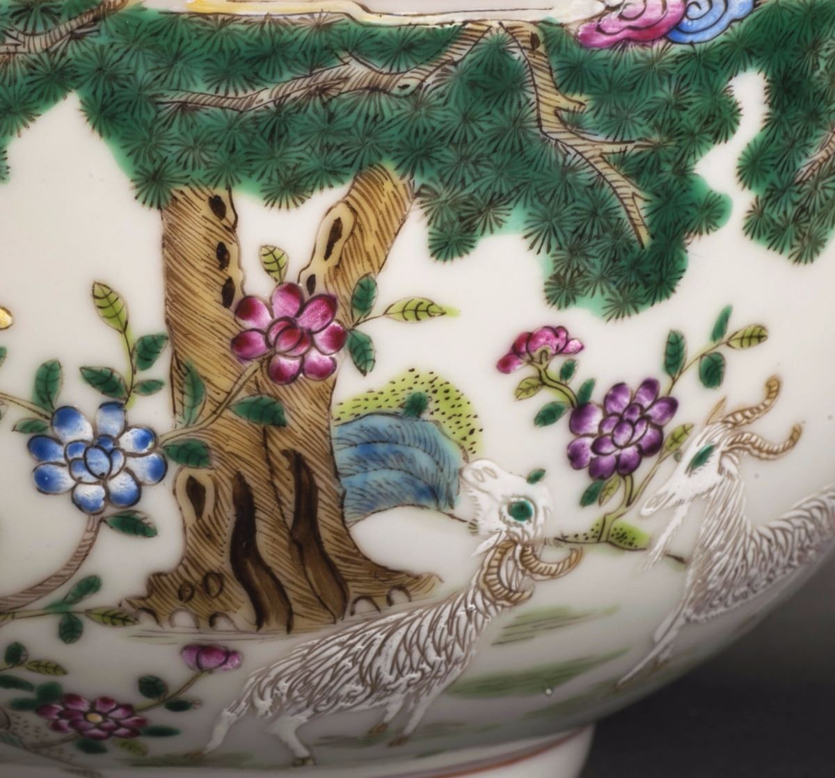 A White Base Glazed Porcelain Bowl In Good Condition. Painted With Three-sheep On The Main Body. The Sheep Was Eating Besides The Vivid Trees And Playing On The Place With Good Views. The Blooming Flowers And TheGreen Trees Symbolize The Live Spring And Good Weather. With Qianlong(1735-1796) Marks On The Bottom.