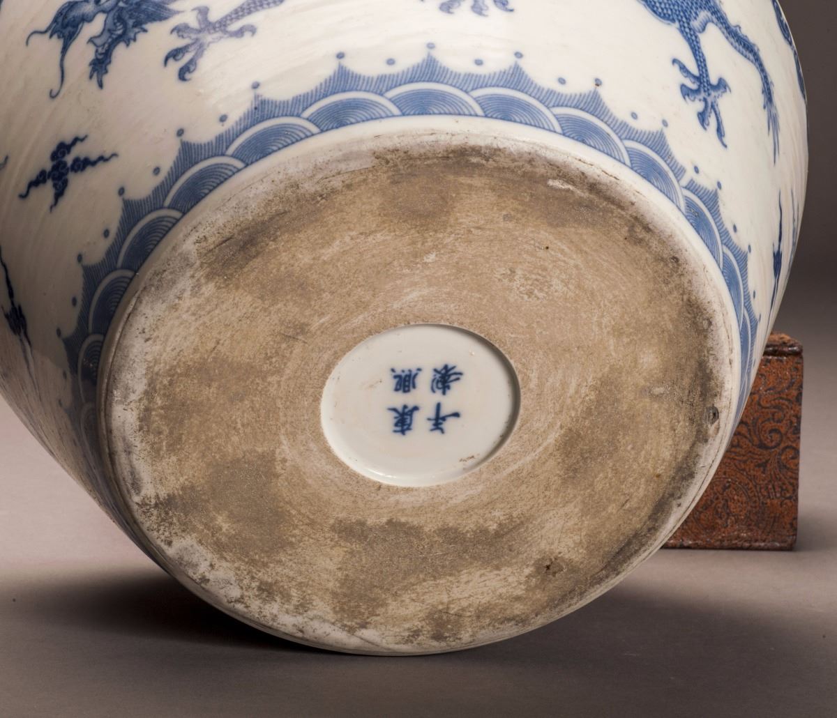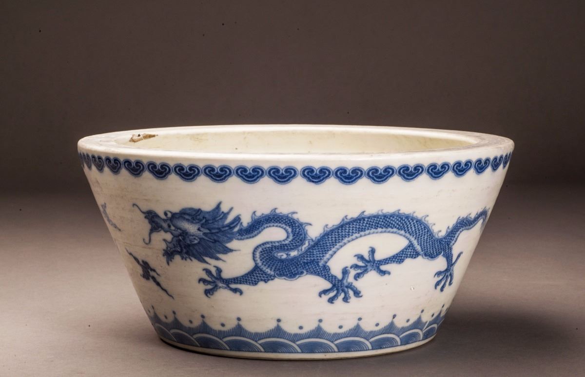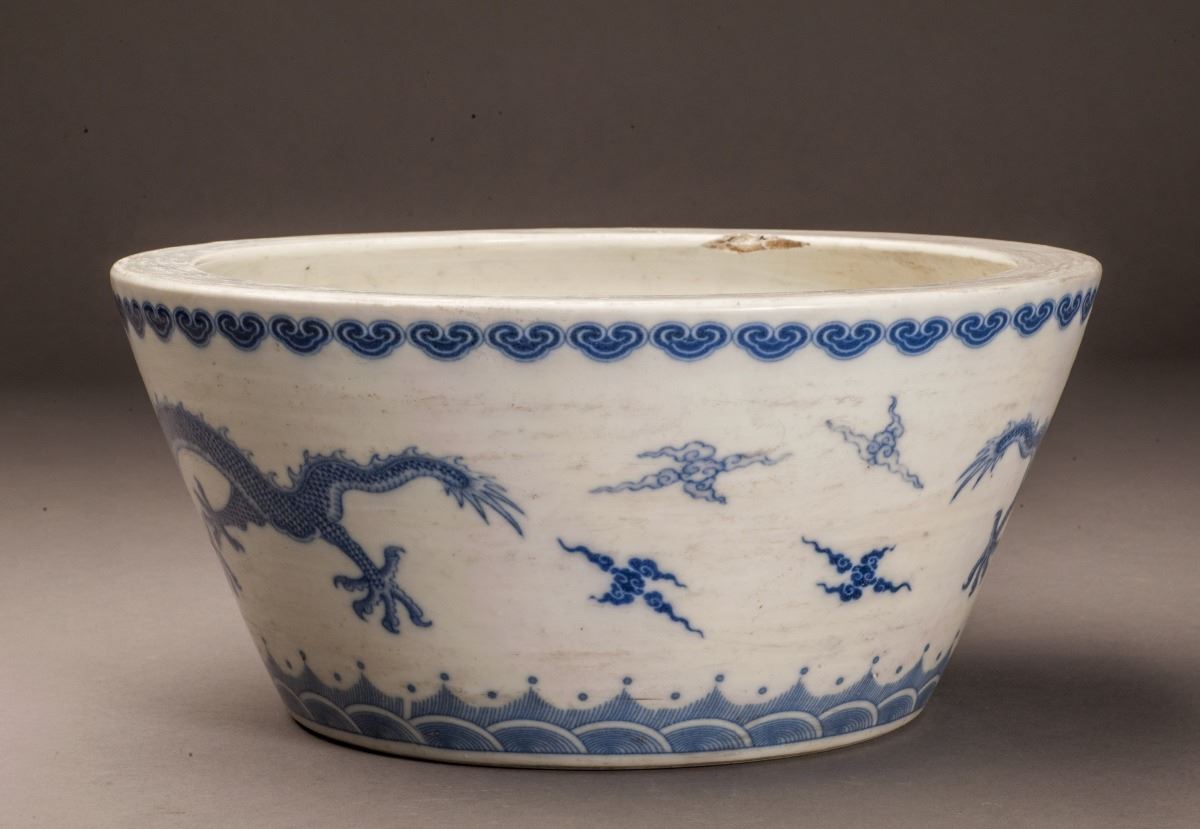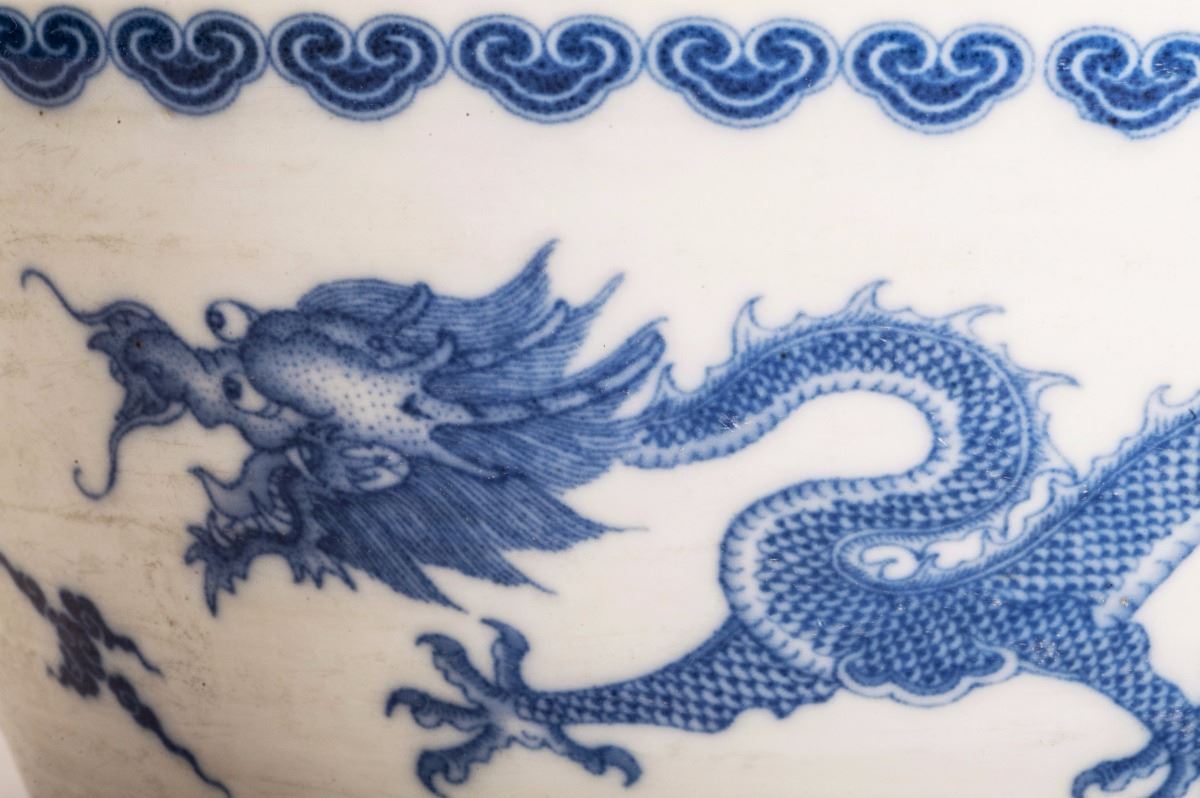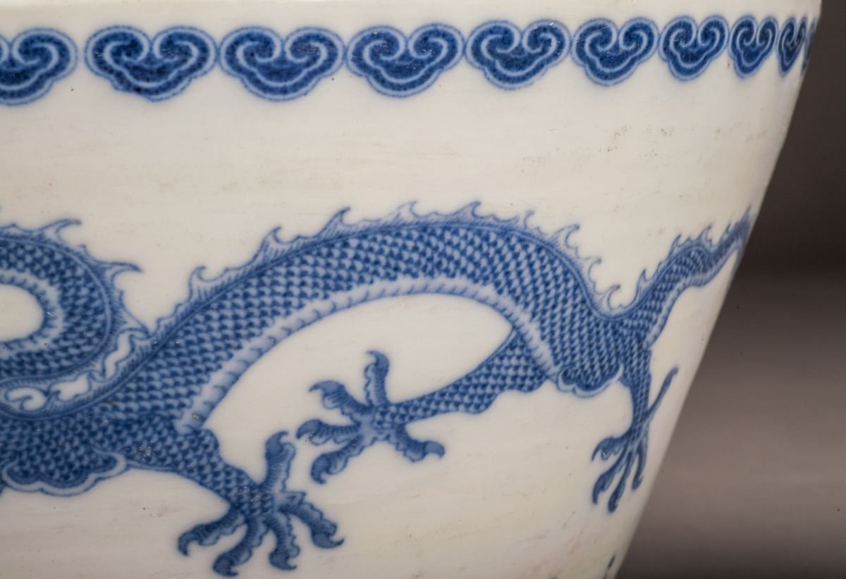 Depicting With Vivid Ascending Dragon Patterns In Beautiful Blue Glaze, Designed In Extremely Detailed And With Its Face And Claws Vividly Expressed. Decorated With A Band Of Ruyi-head At Edge Of Mouth. Marked As "kangxi(1662-1722)" On The Bottom.