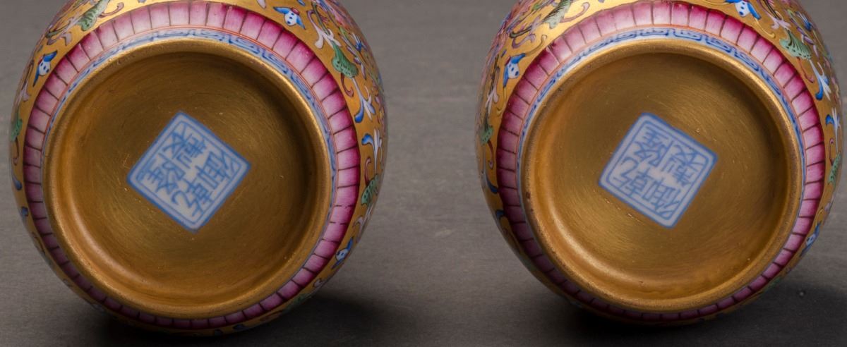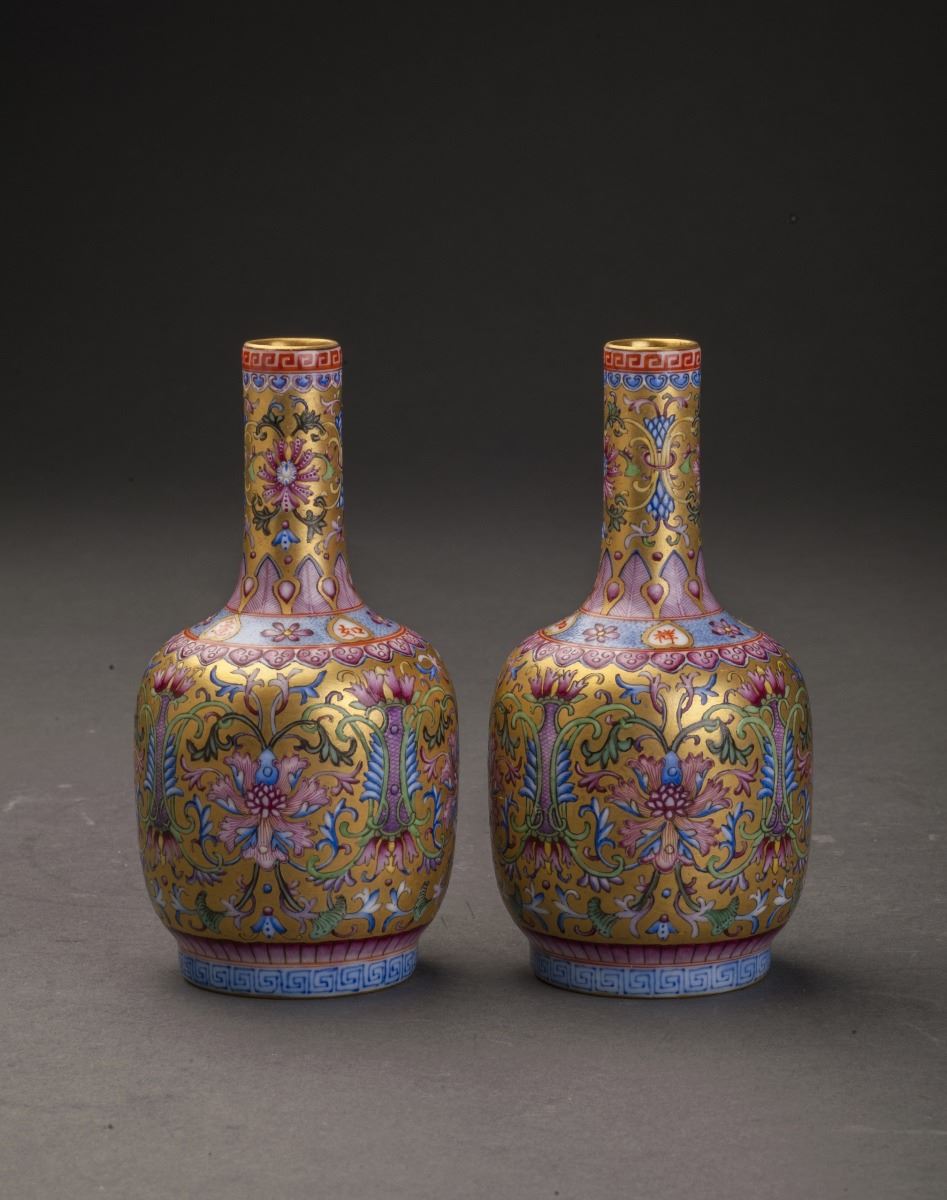 A Pair Of Finely Potted Enamel Glazed Porcelain Vases With Gilding Throughout, Encircled By A Ruyi-head Border Around The Rim, With Lotus Flowers On Scrolling Foliate Stems And Repeated Various Ruyi Head BandsSurrounding On The Bottom Edge. Painted With Delicately Designed Flower Patterns On The Main Body. With Blue Four-character "qian Long Yu Zhi" Marks On The Bottom.