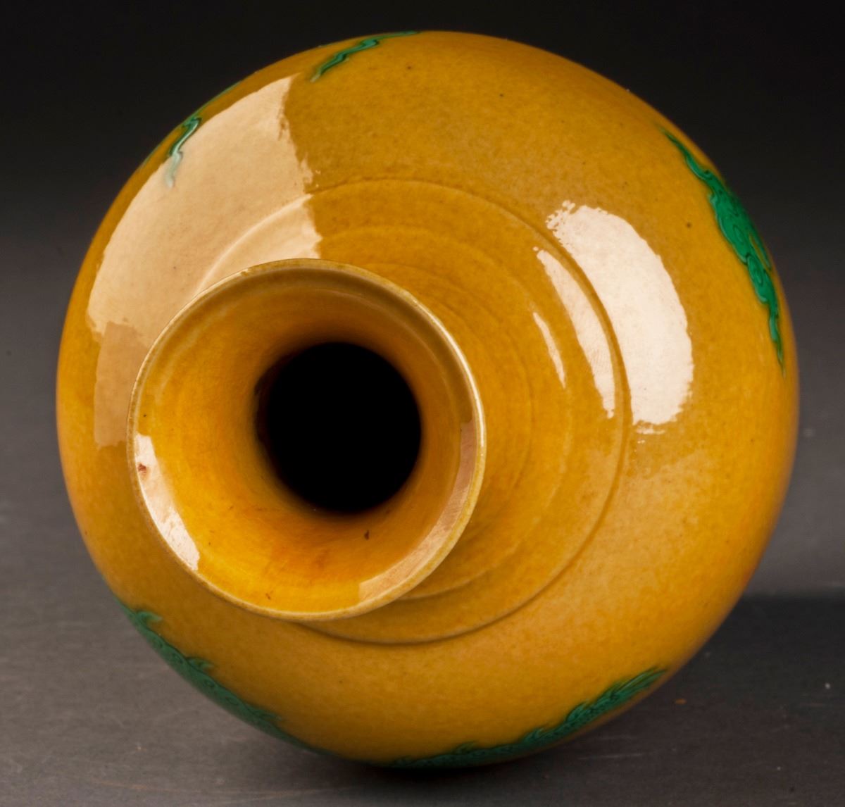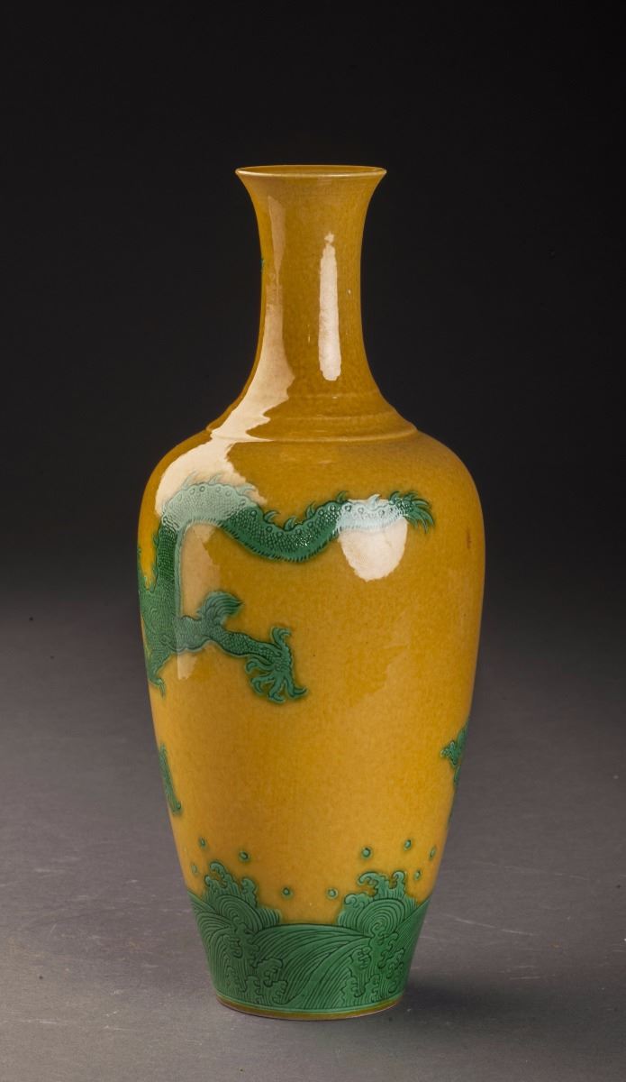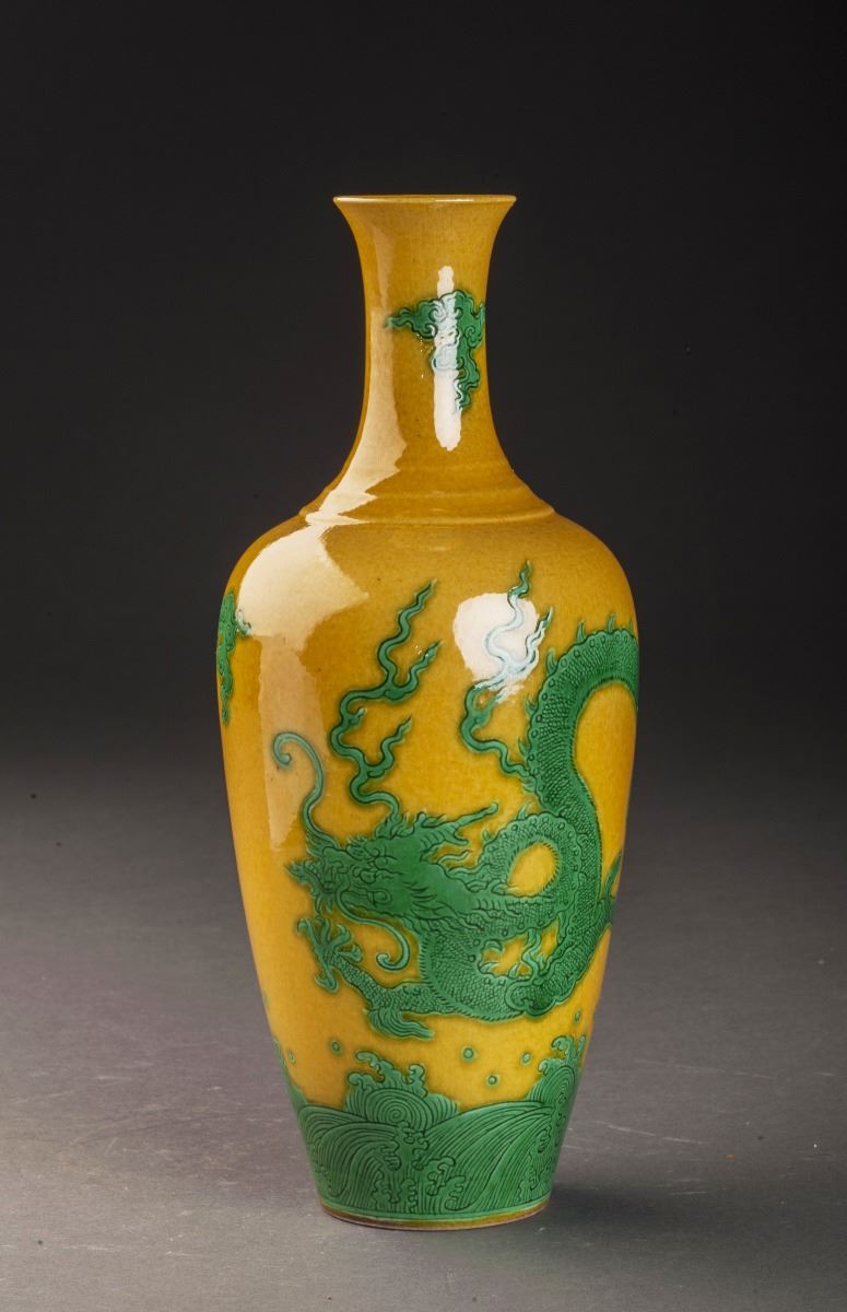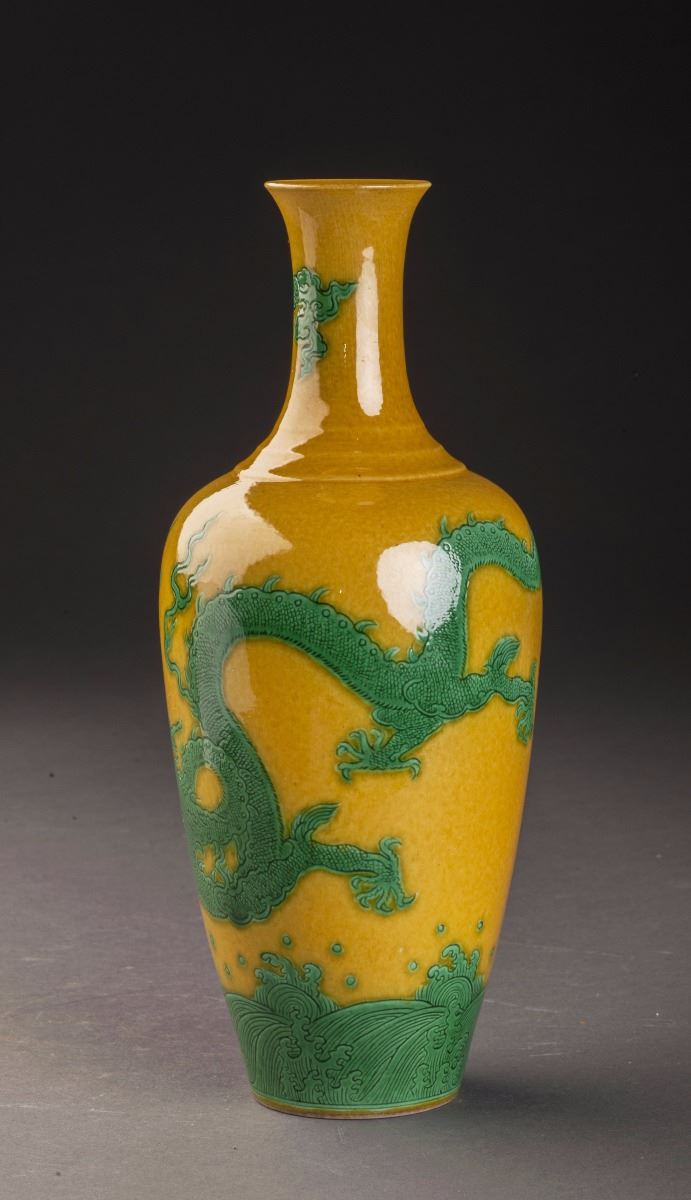 With Fine Yellow Glaze Throughout, This Porcelain Vase With Vivid Painted Dragon Patterns At The Finely Potted Cavetto. The Vivid Dragon In Extremely Detailed And The Face Vividly Expressed. The Globular BodyRaised To The Short And Thin Neck Above, With A Slightly Flaring Mouth At The Top. With The Black Glazed Six-character Marks On The Bottom And Of The Period Of "qianlong(1735-1796)".
