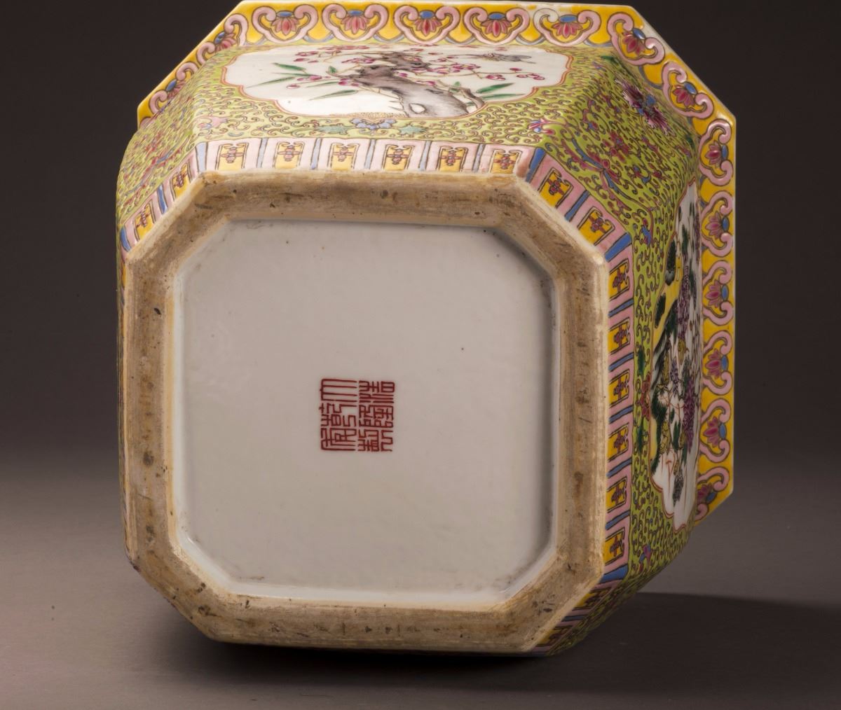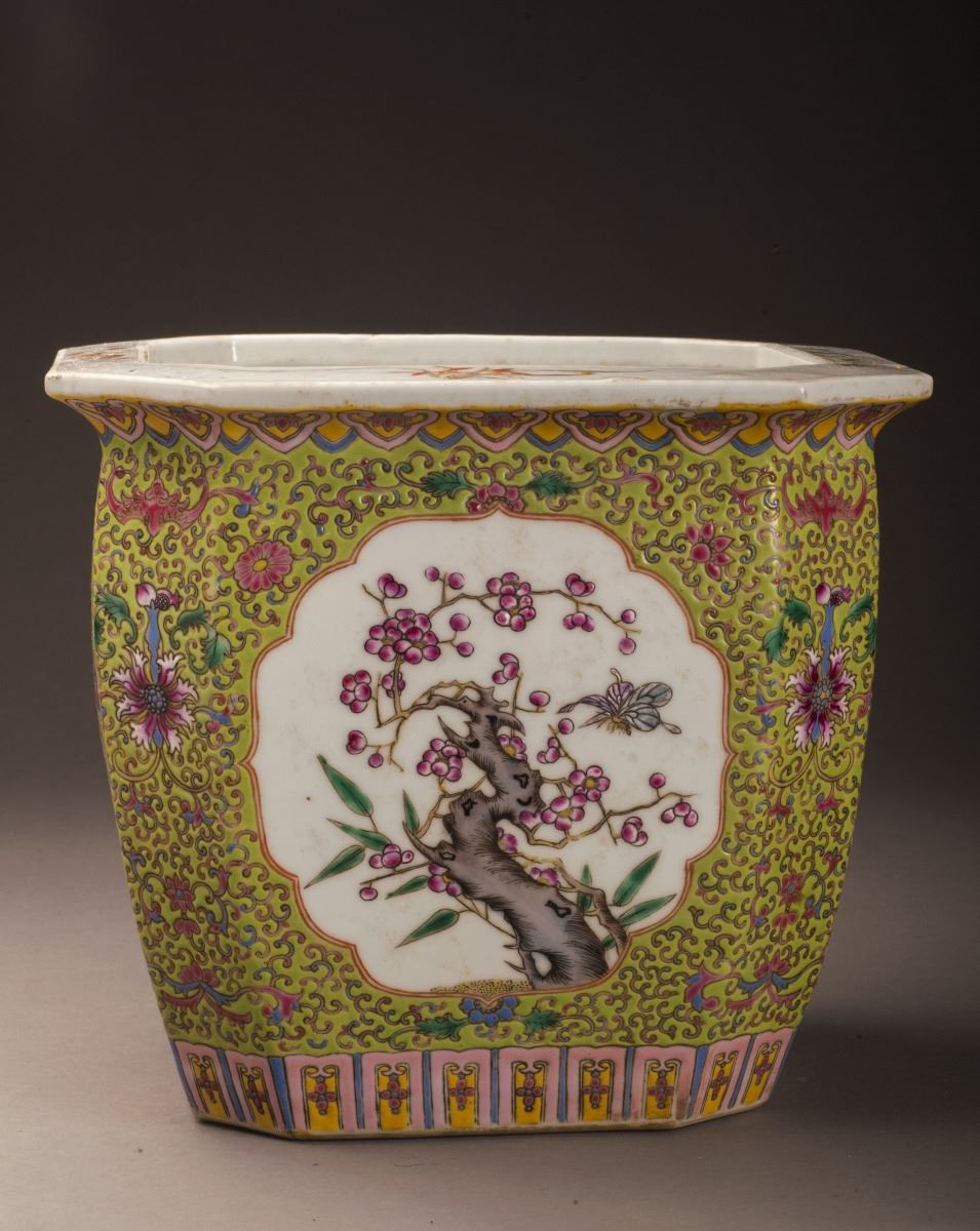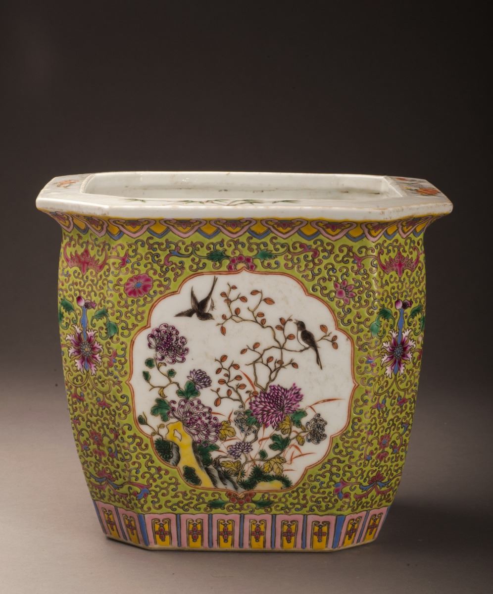 This Fine And Rare Porcelain Flower Pot With Fine Multicolor Glaze Throughout, Within The Form Of Square Shape. Heavily Potted Rim At Edge At Top. The Main Body With Four White Grounds. Each Painted With Vivid Flower AndBirds. Marked As "qianlong(1735-1796)" On The Bottom.