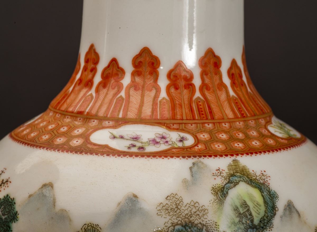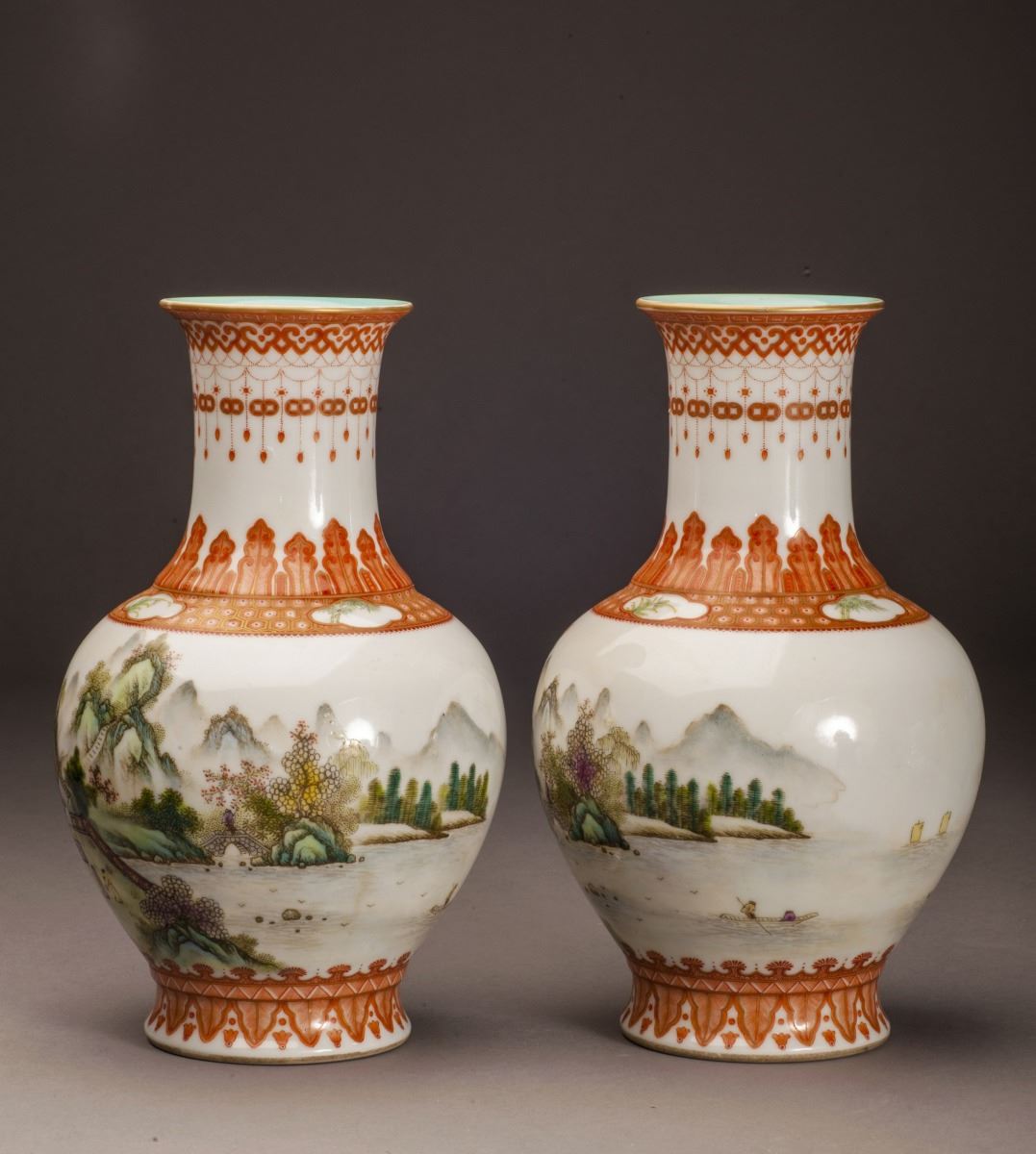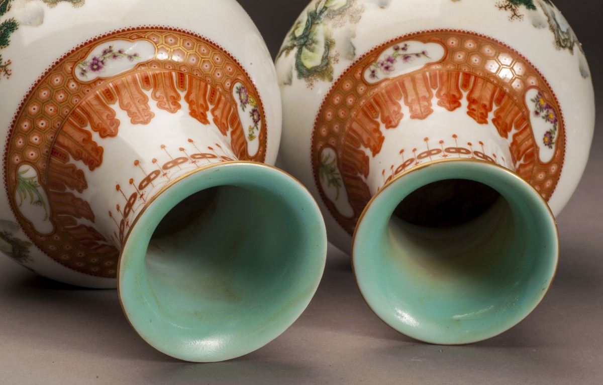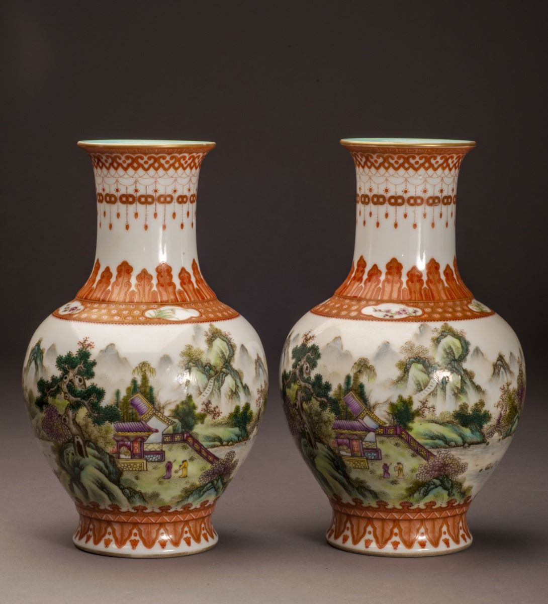 A Pair Of Fine Condition Porcelain Vases, Within Fine Multicolor Glaze Throughout. Painted With Vivid Mountain Landscaping Patterns. Depicted With Vividly Designed Features In Yards. All Set Within TheMountains And Rivers And Rocks. Gilding Moulded Rim At Mouth. Marked As "qianlong(1735-1796)" On The Bottom.
