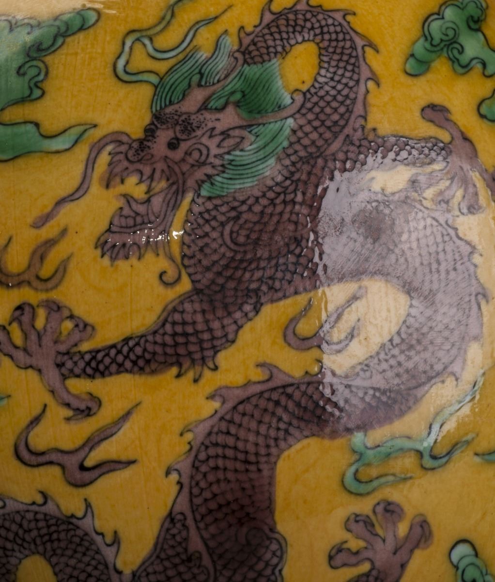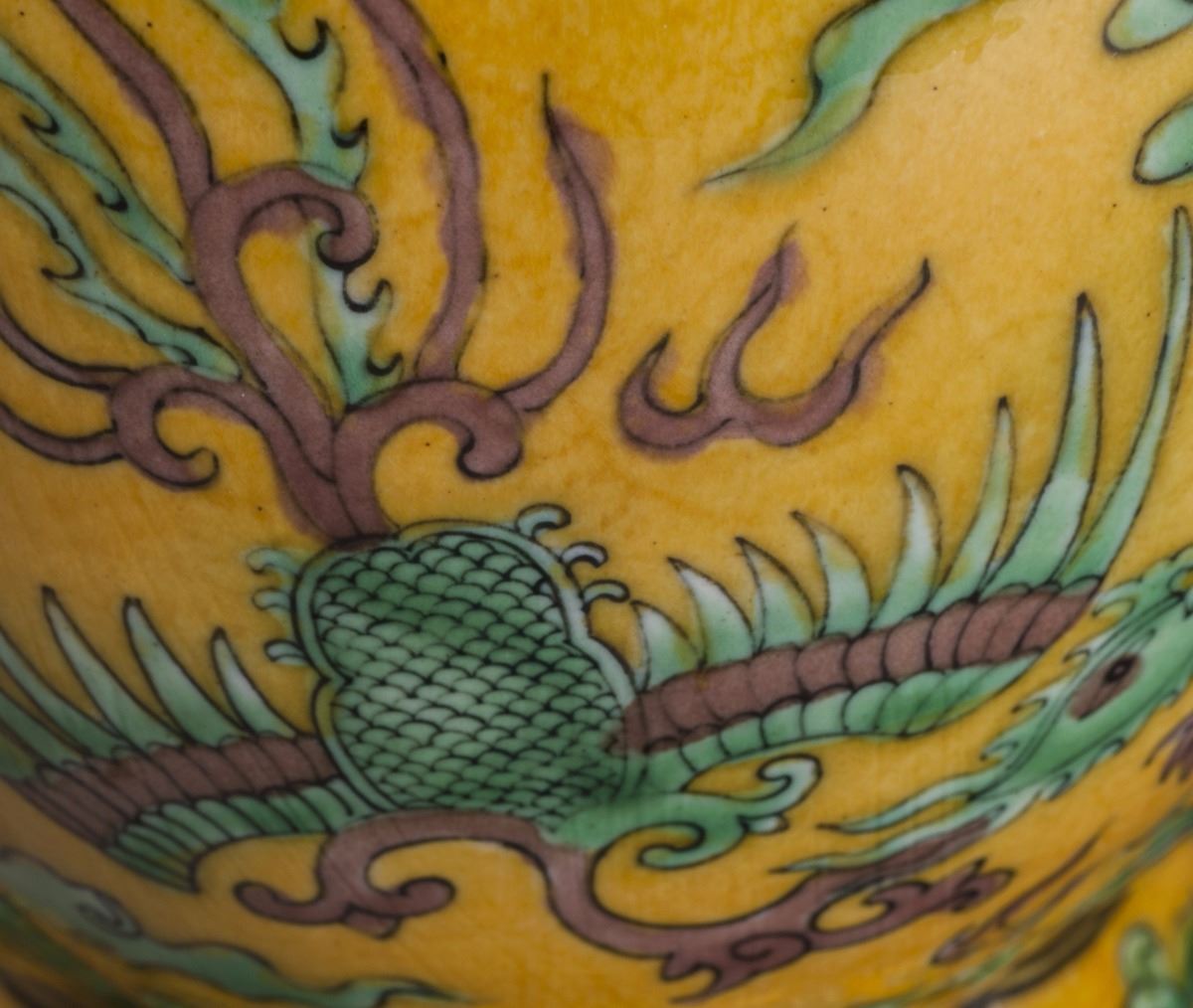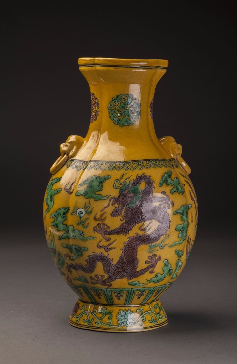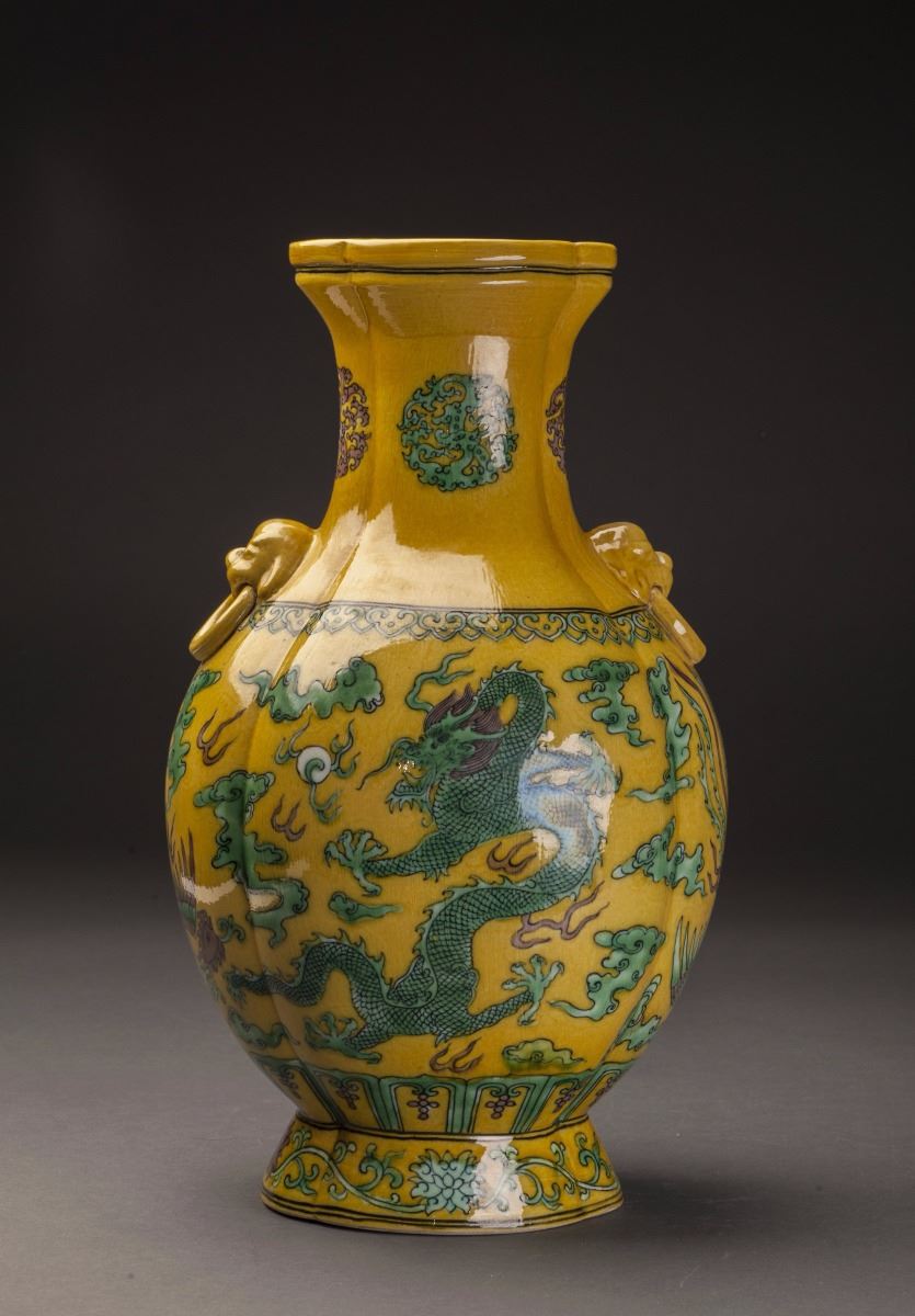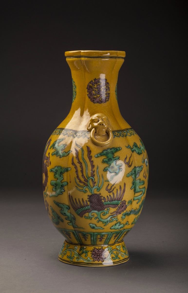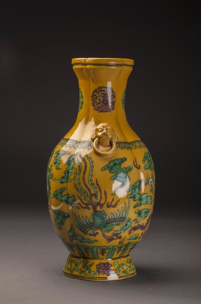 This Beautiful Porcelain Flask With Three-color Glazed And The Yellow-ground Throughout. Painted With The Patterns Of Ascending Dragons And Phoenixes Flying Around The Lucky Green Clouds. Two DelicatelyDesigned Animal-head Shape Handles On Both Sides. Slightly Flaring Mouth Above The Round Belly. With The Qianlong(1735-1796) Marks On The Bottom.