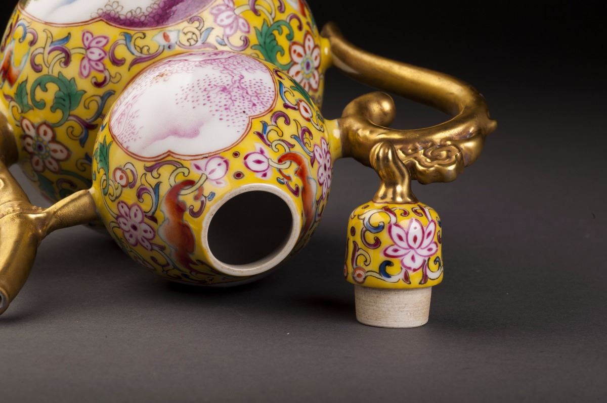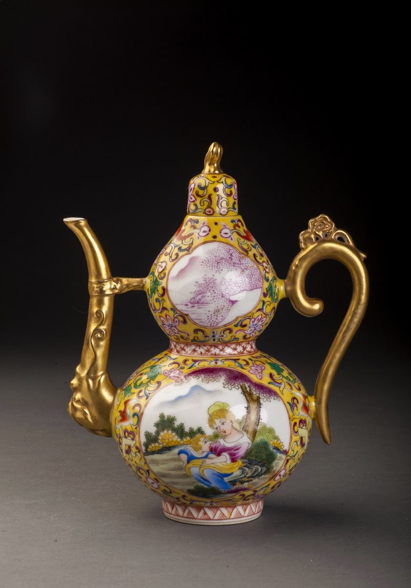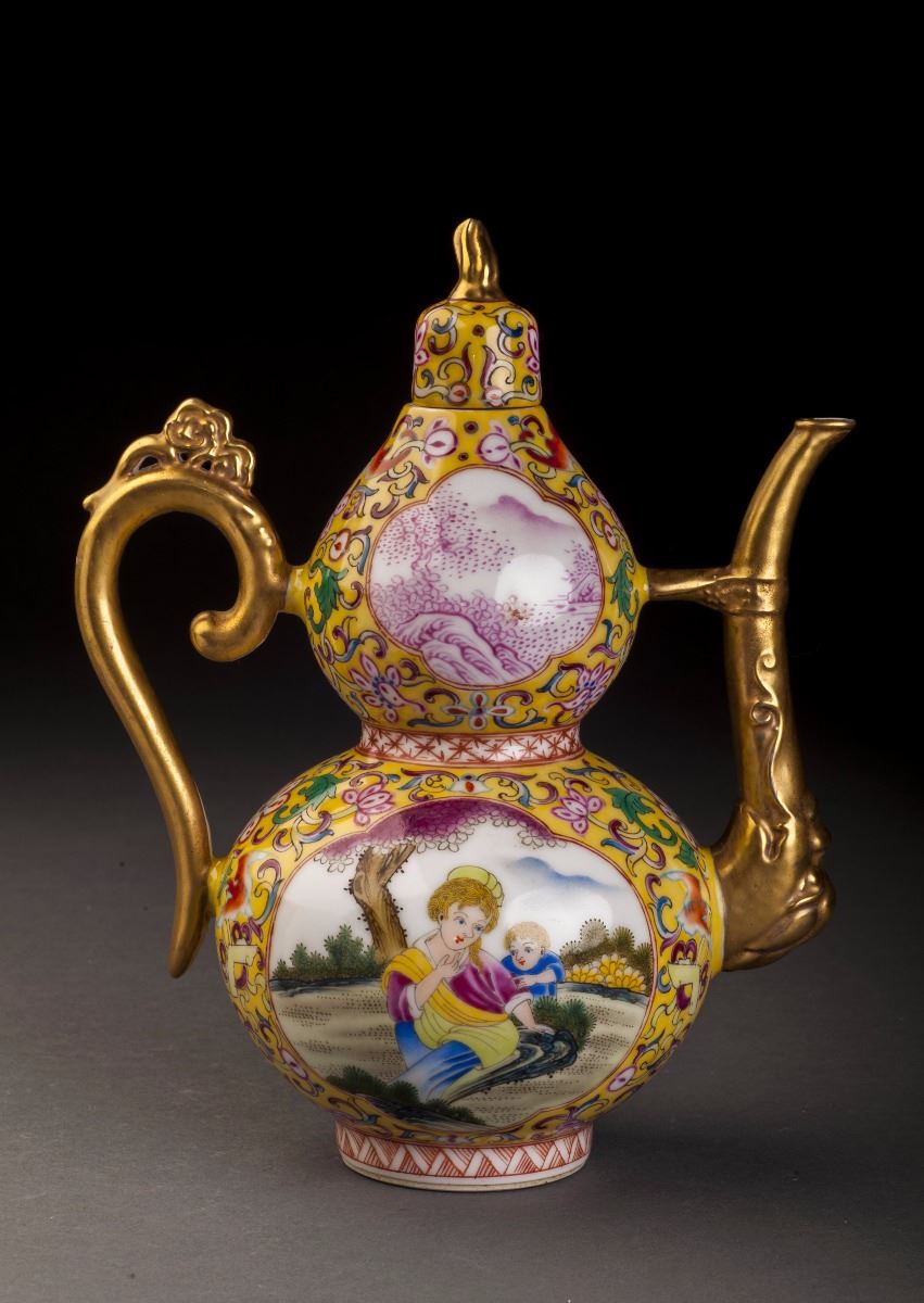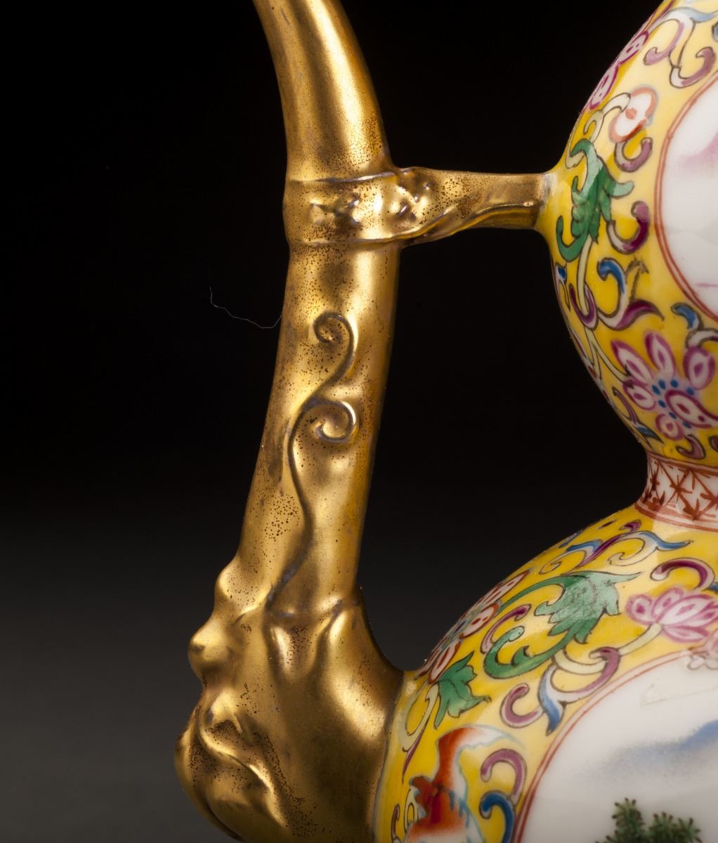 A Fine And Rare Gourd-shaped Porcelain Pot In Good Condition. With The Fine Yellow Glaze As The Base And Painted With The Delicate Designed Multiple Treasure Patterns On The Finely Potted Round Body. Two White GlazedGrounds On Each Sides And Decorated With The Foreign People Features. The Beautiful Woman Siting On T He Grass And Holding A Cute Kid In Her Arms. Gilt Sprout And Handles. Marked As "official Made Of The Period Of