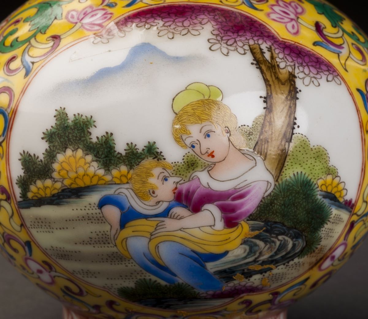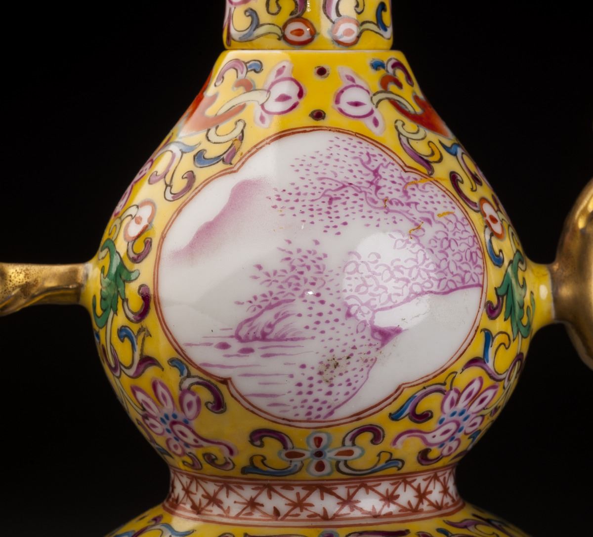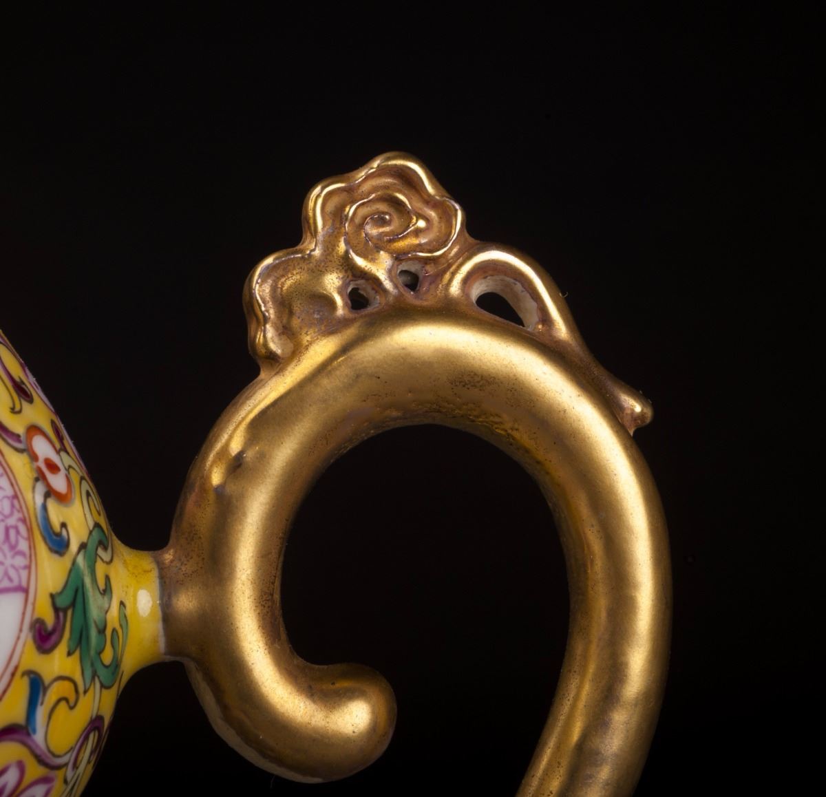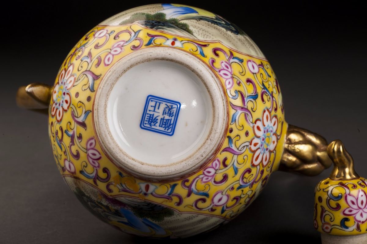 A Fine And Rare Gourd-shaped Porcelain Pot In Good Condition. With The Fine Yellow Glaze As The Base And Painted With The Delicate Designed Multiple Treasure Patterns On The Finely Potted Round Body. Two White GlazedGrounds On Each Sides And Decorated With The Foreign People Features. The Beautiful Woman Siting On T He Grass And Holding A Cute Kid In Her Arms. Gilt Sprout And Handles. Marked As "official Made Of The Period Of