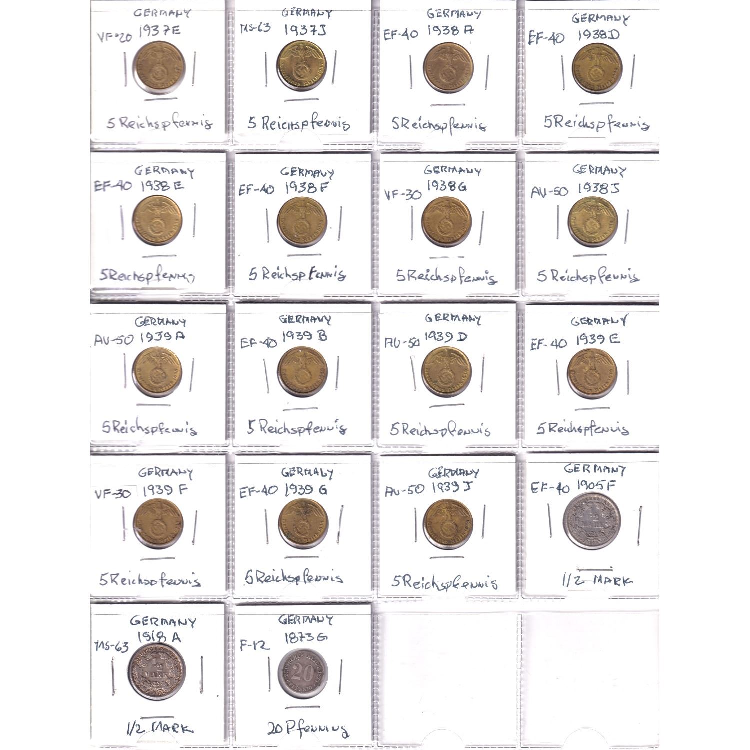18x Germany 5 Reich pfennig, 20 Pfennig & 1/2 mark coins grades appears to be from If to MS condition. Please view scan for details. 18pcs