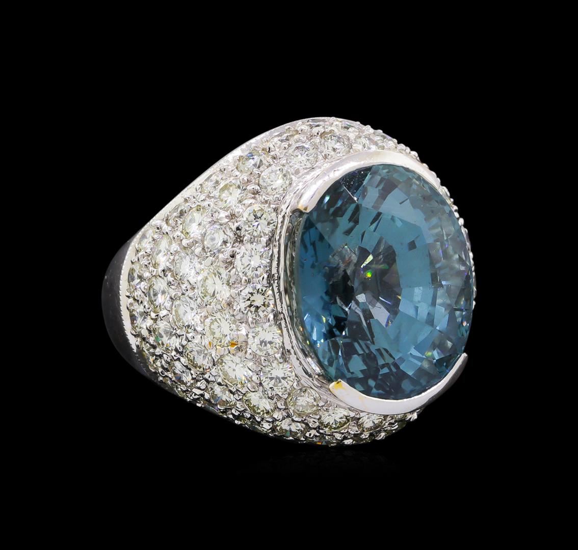 One electronically tested platinum ladies cast sapphire and diamond ring with a bright polish finish. The featured sapphire is set within a diamond set curvature supported by a lattice under gallery and tapering shoulders, completed by a five millimeter wide band. Identified with markings of "90%. ". Condition is good. Containing: One prong set oval mixed cut natural blue sapphire, measuring 15.70 x 12.80 x 10.25mm, 10%. bulge factor, approximate weight of 19.03ct., clarity is slightly included, type II, medium, slightly grayish, blue color, (GIA B 5/2), cut is good. Transmitting light with a minimum of distortion, transparent. Naturally occurring internal & external characteristics are present. Colored Stone Grading Report attached. Graded in the setting. Seventy-Eight prong set round brilliant cut diamonds, measuring 2.50 - 2.00. x 1.35mm (depth est.) approximate total weight of 78 Stones = 3.34ct. Graded in the setting. Clarity: VS-1 to SI-1 . Color: G - I. Total Weight of Colored Stones 19.03ct.. Total Weight of Diamonds 3.34ct.. Total Weight of Ring 18.19gm. AIG Appraised at $61,685.00.