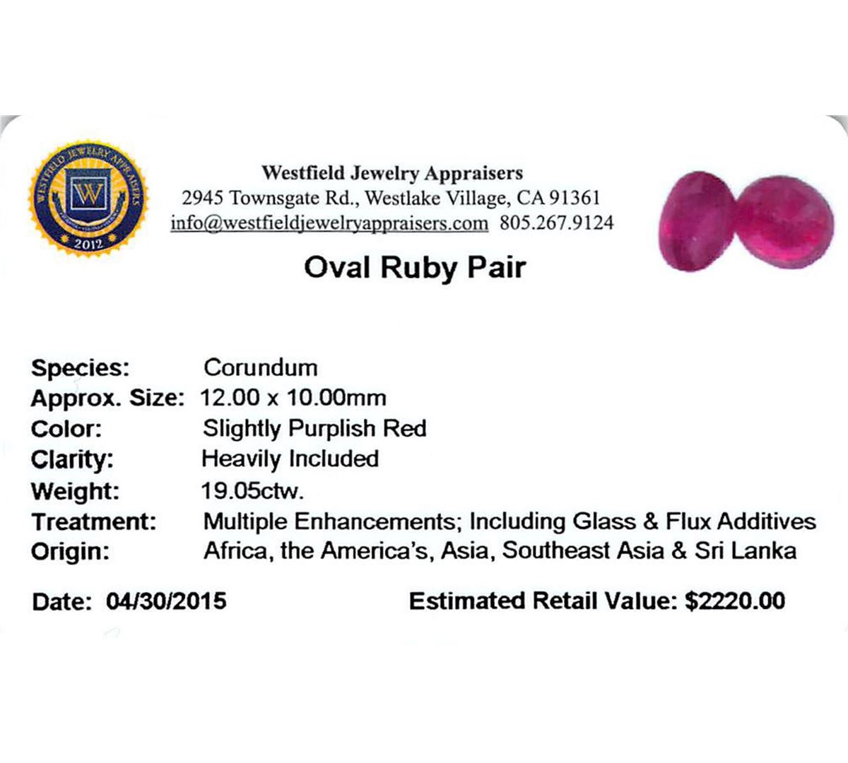 Two oval mixed cut natural rubies, measuring 12.00 x 10.00 x 6.50mm, exact total weight 19.05ct., clarity is heavily included, type II, dark, very slightly brownish, slightly purplish red color, (GIA slpR 7/3), cut is good. Transmitting light somewhat diffusely, translucent. Naturally occurring internal & external characteristics are present. Indications of laboratory high temperature heat treatment, with glass & flux additives. Ruby has a low tolerance to rhodium plating, repolishing the surface, & ultrasonic cleaning. Westfield Appraised at $2,220.00.