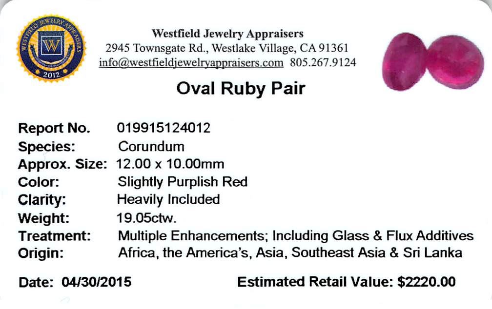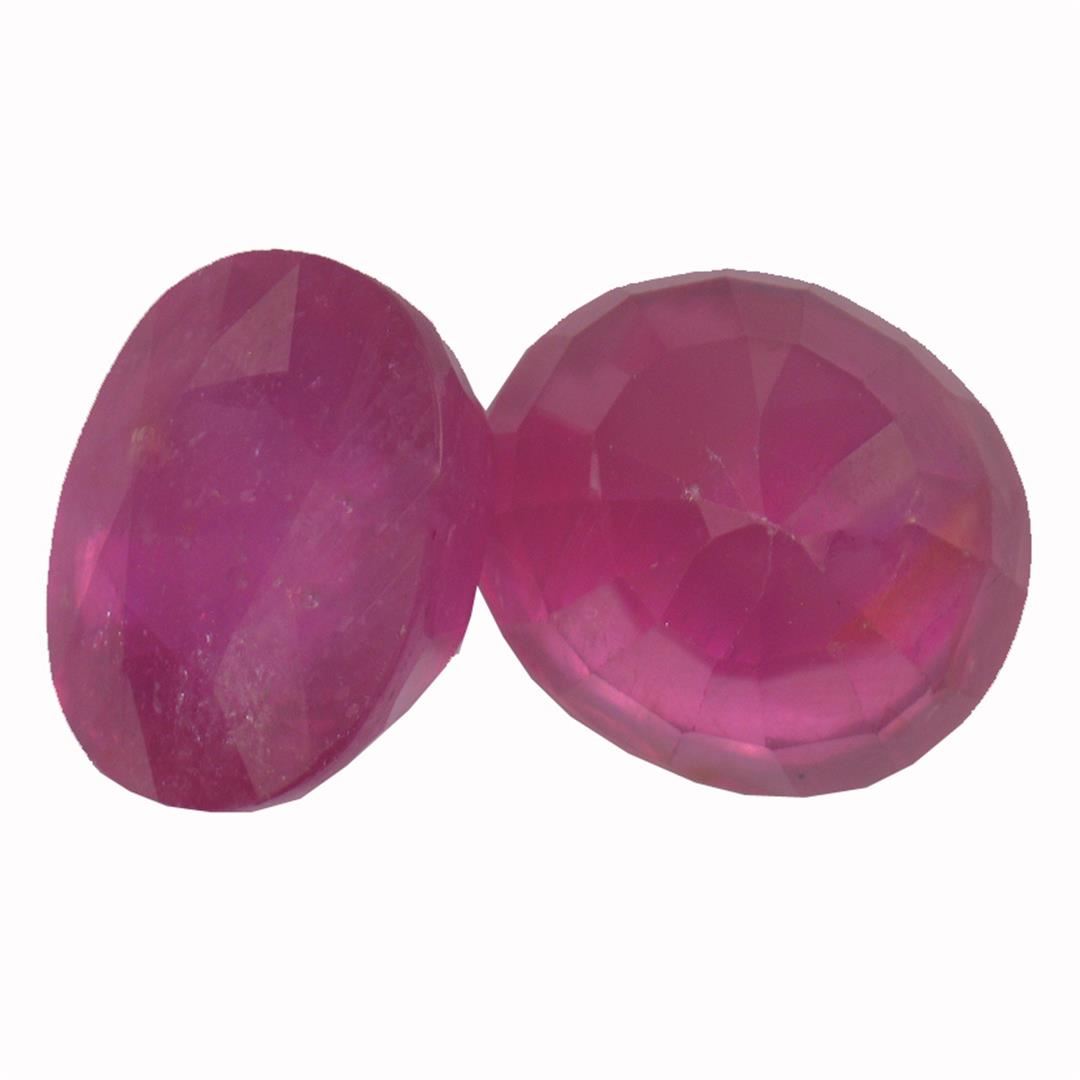 Two oval mixed cut natural rubies, measuring 12.00 x 10.00 x 6.50mm, exact total weight 19.05ct., clarity is heavily included, type II, dark, very slightly brownish, slightly purplish red color, (GIA slpR 7/3), cut is good. Transmitting light somewhat diffusely, translucent. Naturally occurring internal & external characteristics are present. Indications of laboratory high temperature heat treatment, with glass & flux additives. Ruby has a low tolerance to rhodium plating, repolishing the surface, & ultrasonic cleaning. Westfield Appraised at $2,220.00.