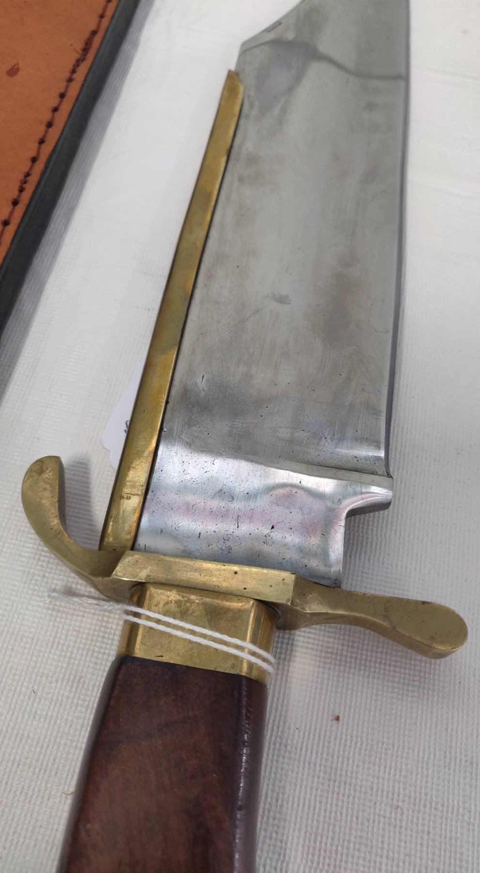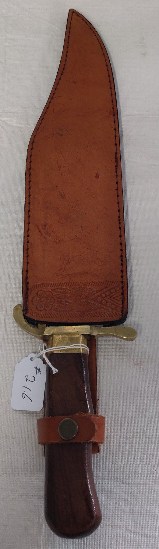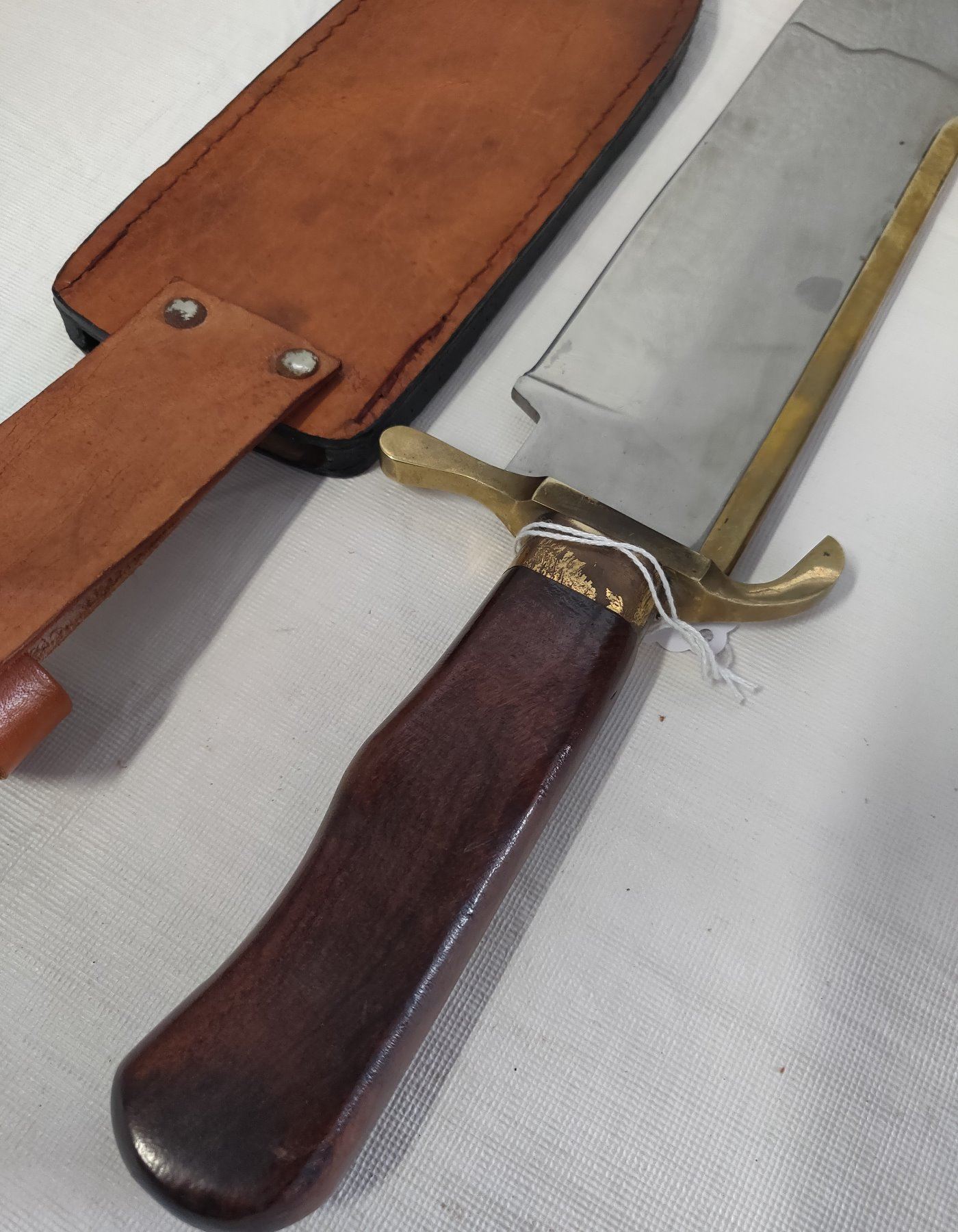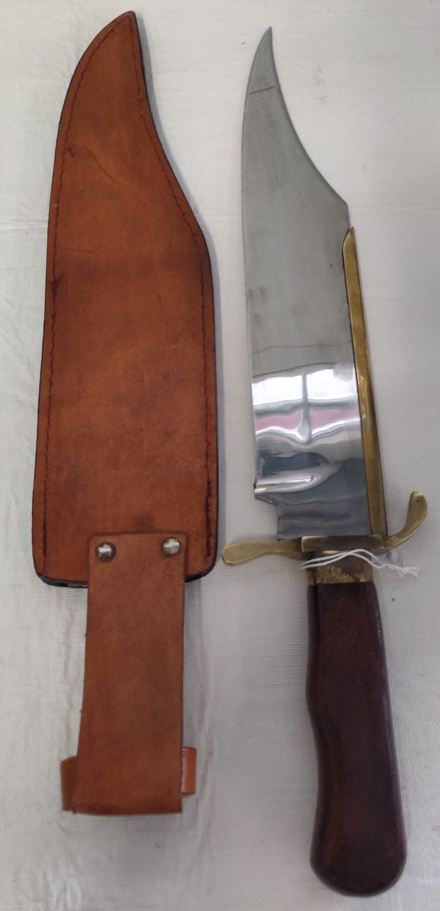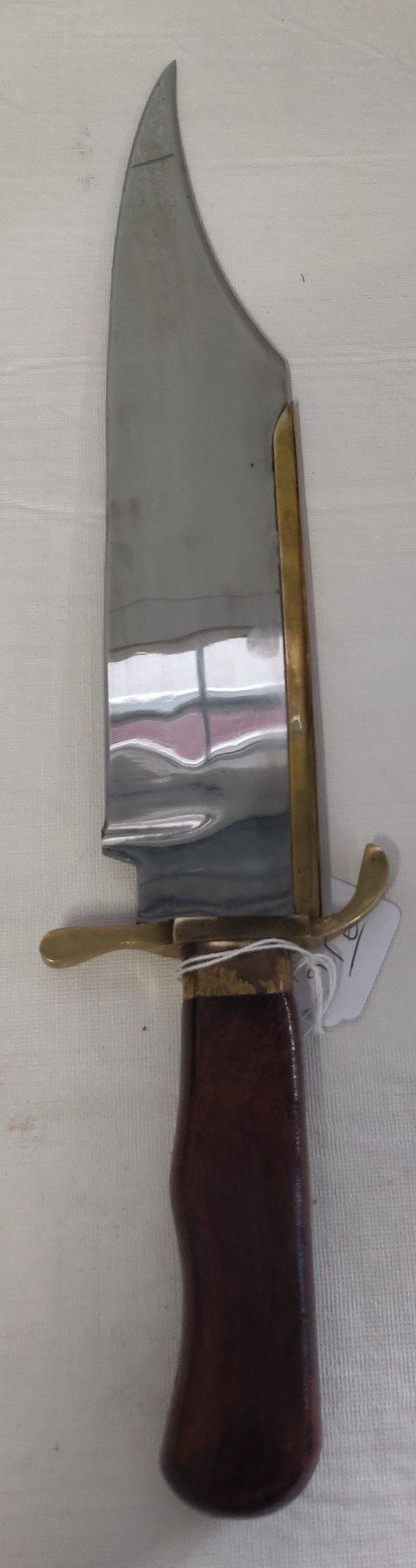 19 1/2" Bowie Knife, 20th century item. Made of wood, brass, steel and leather, the item measures 19 1/2" x 3 1/2". Pakistan, marked on blade near tip. Condition: Good, guard slightly loose, see images. Shipping: $22.50 w/insurance and signature, due to length.