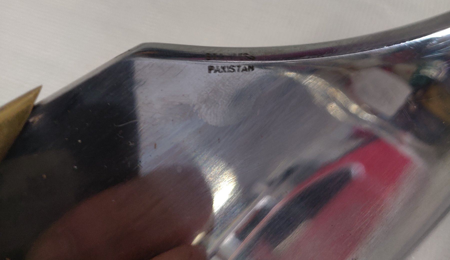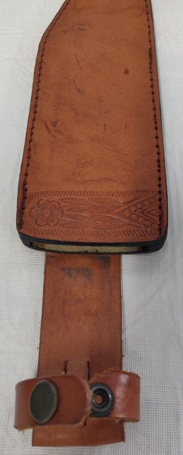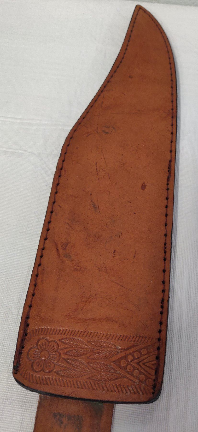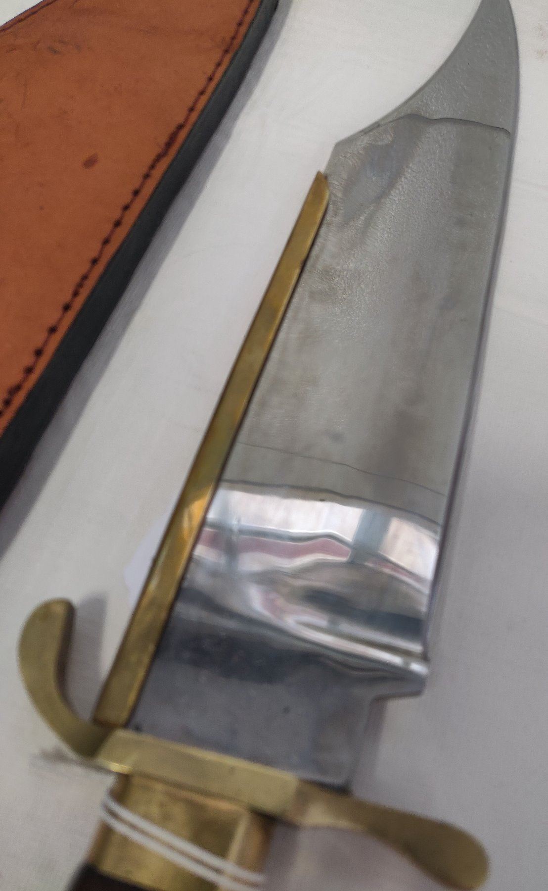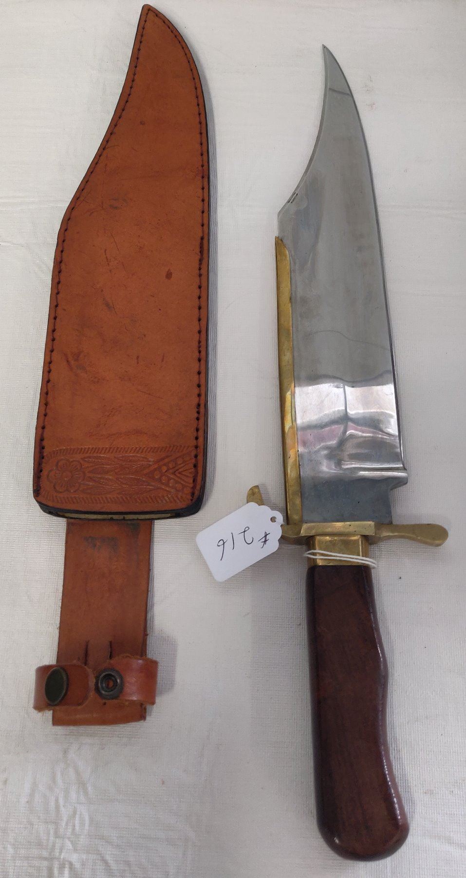 19 1/2" Bowie Knife, 20th century item. Made of wood, brass, steel and leather, the item measures 19 1/2" x 3 1/2". Pakistan, marked on blade near tip. Condition: Good, guard slightly loose, see images. Shipping: $22.50 w/insurance and signature, due to length.