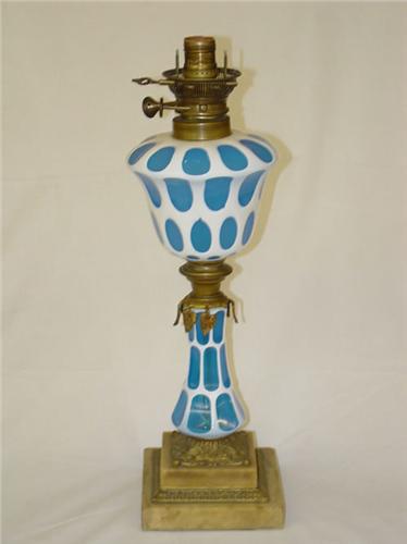 19 1/2" SANDWICH CUT OVERLAY LAMP ON STEPPED MARBLE BASE, WHITE CUT TO BLUE - CONVERTED & DRILLED FOR ELECTRIC FITTINGS, FRACTURE CRACK TO FONT