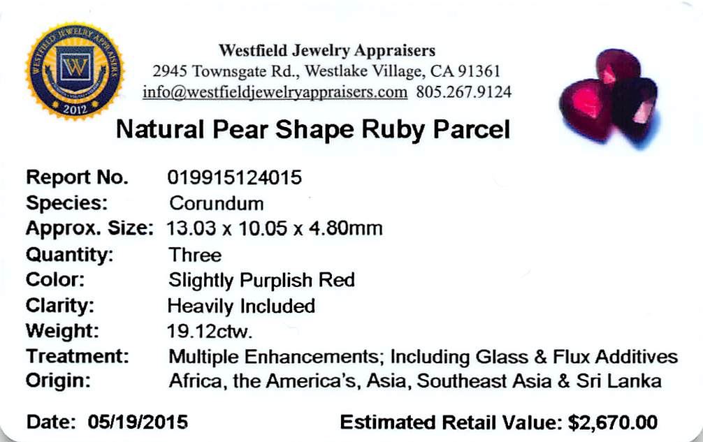 Three pear mixed cut natural rubies, measuring 13.03 x 10.05 x 4.80mm, exact total weight 19.12ct., clarity is heavily included, type II, dark, very slightly brownish, slightly purplish red color, (GIA slpR 7/3), cut is good. Measurements are an average for the group. Transmitting light somewhat diffusely, transparent to translucent. Naturally occurring internal & external characteristics are present. Indications of laboratory high temperature heat treatment, with glass & flux additives. Westfield Appraised at $2,670.00.