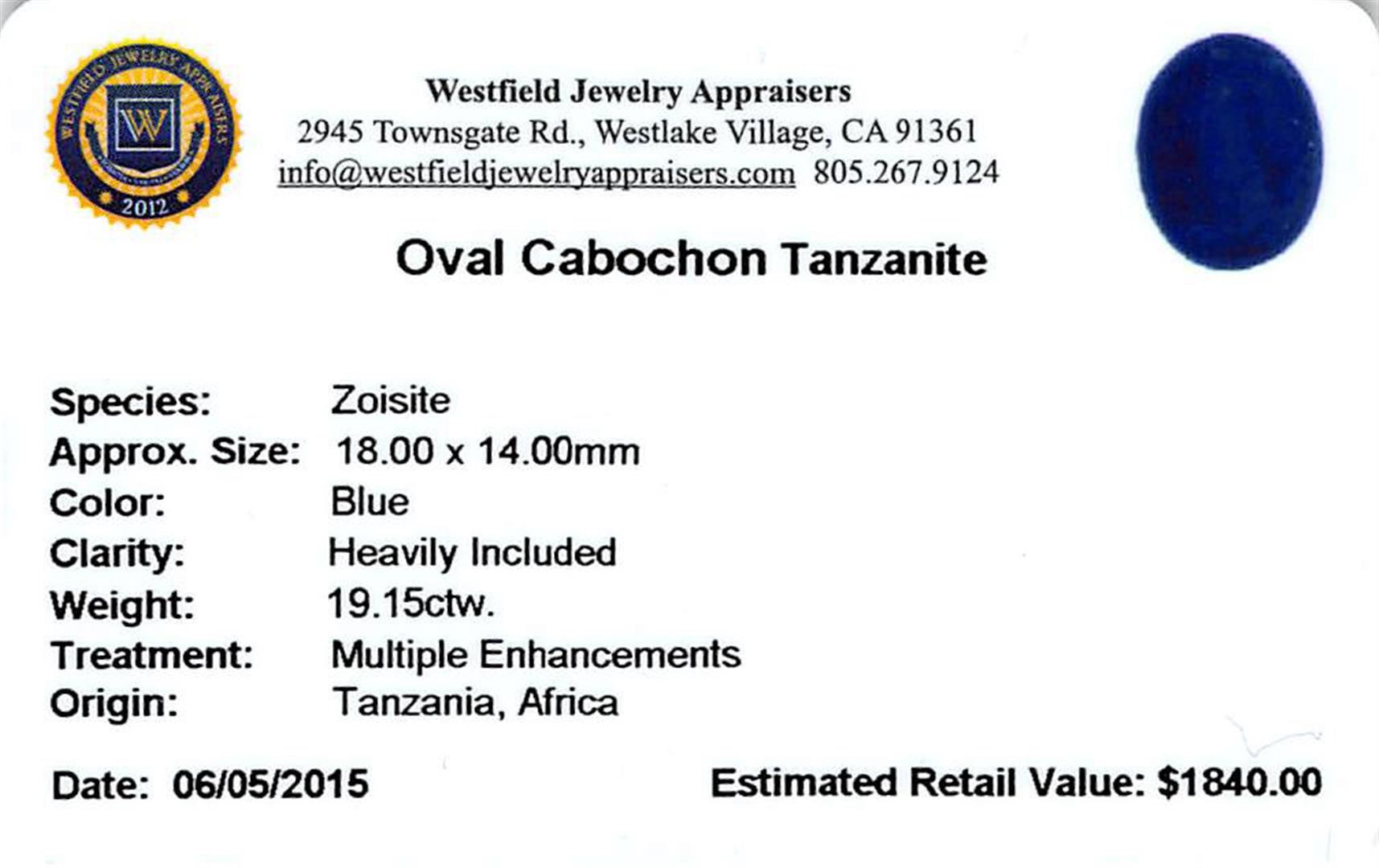 One oval cabochon cut natural tanzanite, measuring 18.00 x 14.00 x 9.00mm, exact weight 19.15ct., clarity is heavily included, type I, dark, very slightly grayish, blue color, (GIA B 7/3), cut is good. Transmitting light somewhat diffusely, transparent to translucent. Naturally occurring internal & external characteristics are present. Indications of heat treatment. Westfield Appraised at $1,840.00.