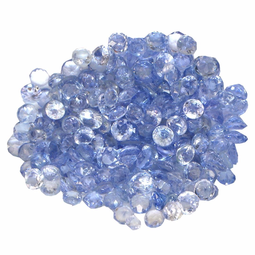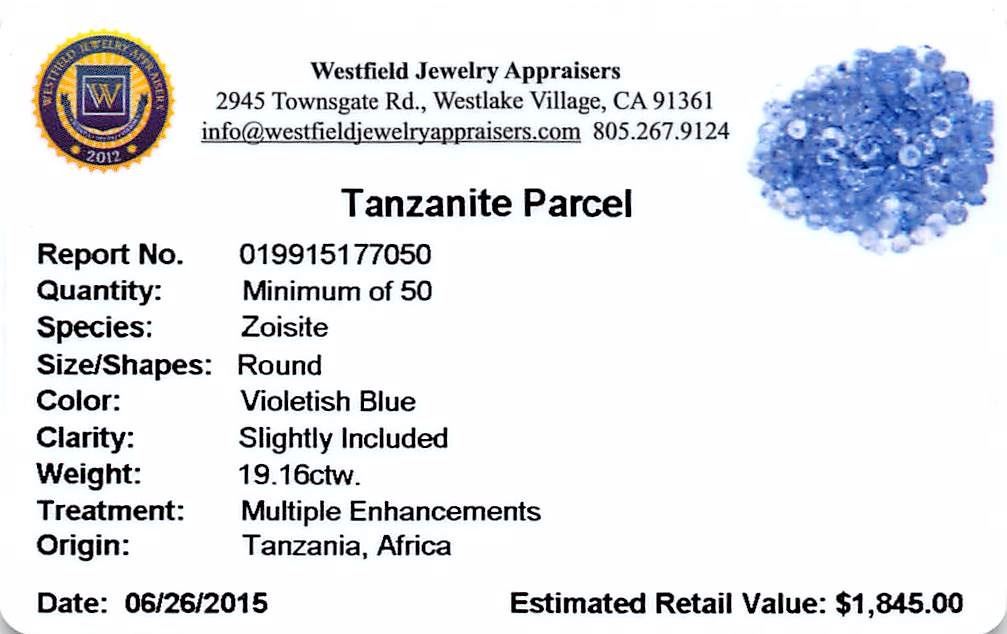 Fifty round mixed cut natural tanzanites, measuring 2.00 - 2.00 x 1.30 mm, exact total weight 19.16ct., clarity is slightly included, type I, medium, very slightly grayish, violetish blue color, (GIA vB 5/3), cut is good. Measurements & the color grade are an average for the group, Color grade is an average for the group, Transmitting light with no distortion, transparent, Naturally occurring internal & external characteristics are present, Indications of multiple laboratory enhancements, including high temperature heat treatment. Westfield Appraised at $1,845.00.