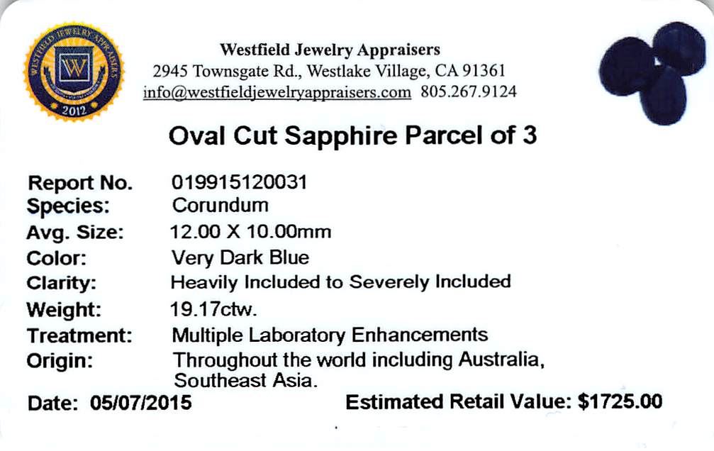 Three oval cut sapphires, measuring 12.00 x 10.00mm, approximate total weight of 19.17ct., clarity is heavily included to severely included, very dark blue color. Indications of multiple laboratory enhancements. Westfield Appraised at $1,725.00.