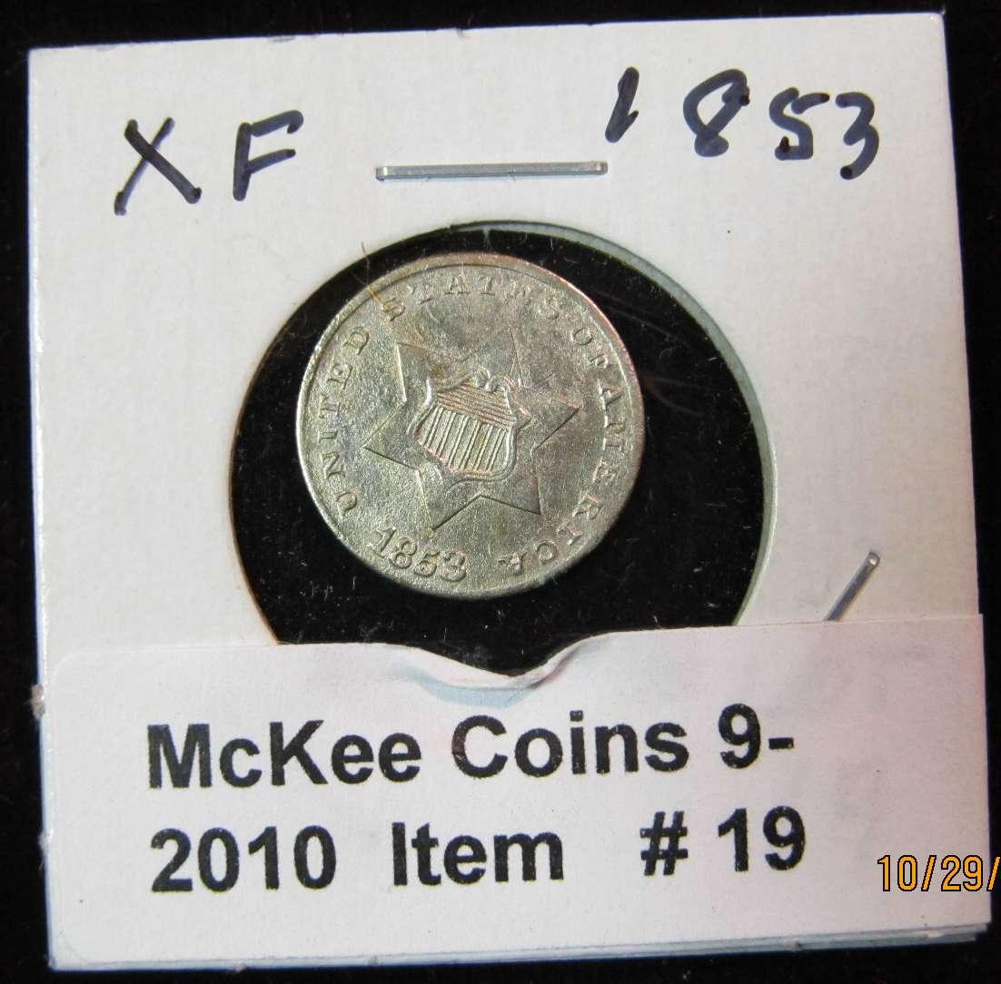 19. 1853 U.S. Three Cent Silver. EF 40.